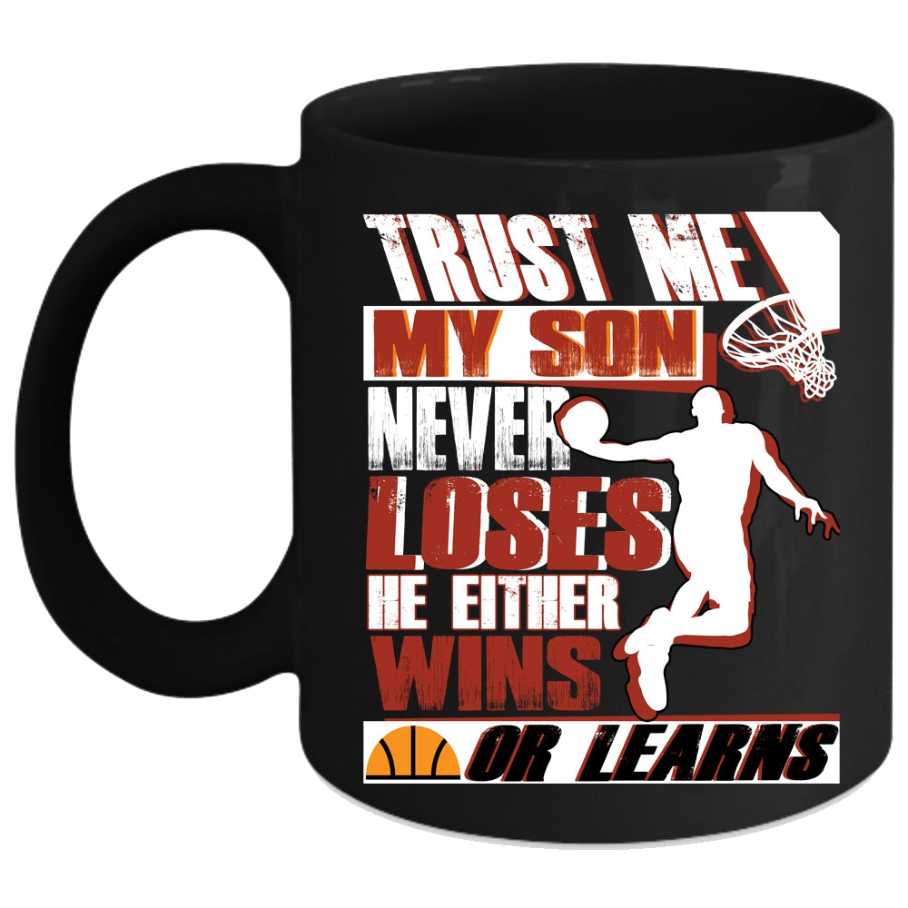 My Son Never Loses He Either Wins Or Learns Coffee Mug, Basketball Coffee Cup