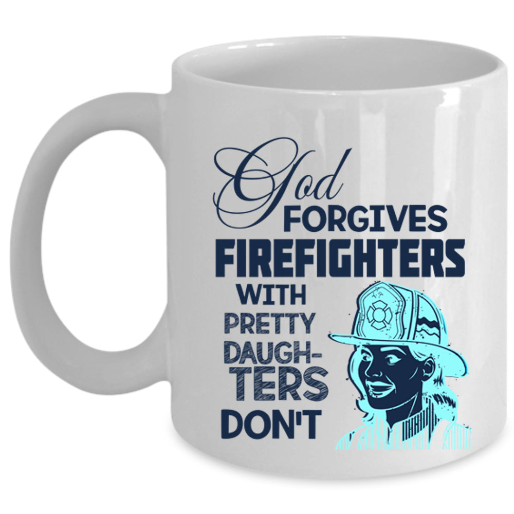 Pretty Daughters Coffee Mug, God Forgives Firefighters Cup