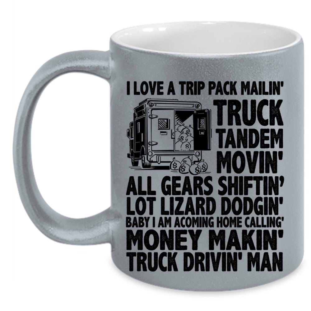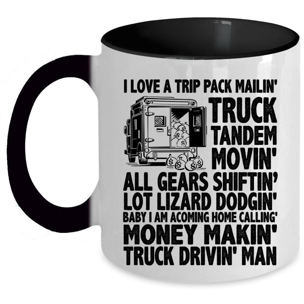 Truck Driving Man Coffee Mug, I Love A Trip Pack Mailing Truck Tandem Accent Mug