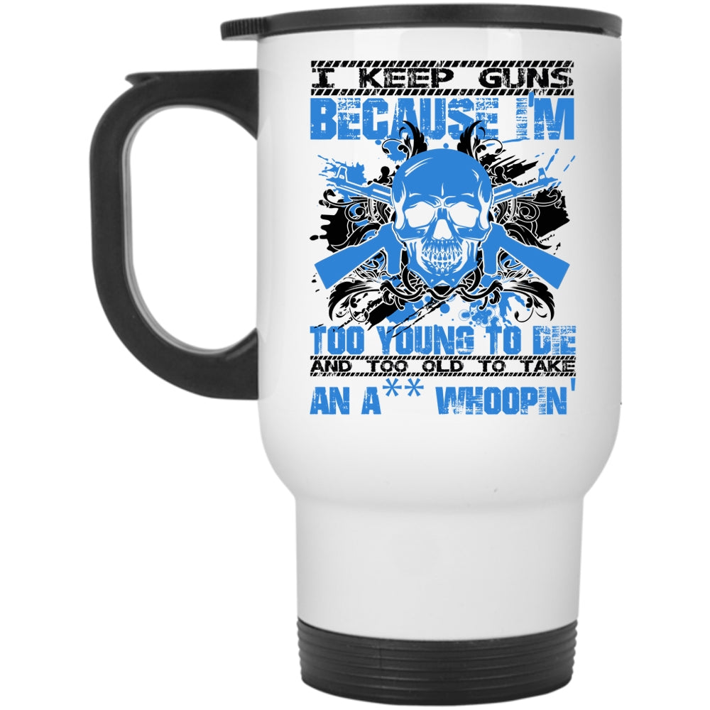 Funny Saying Travel Mug, I Keep Guns Because I'm Too Young Mug