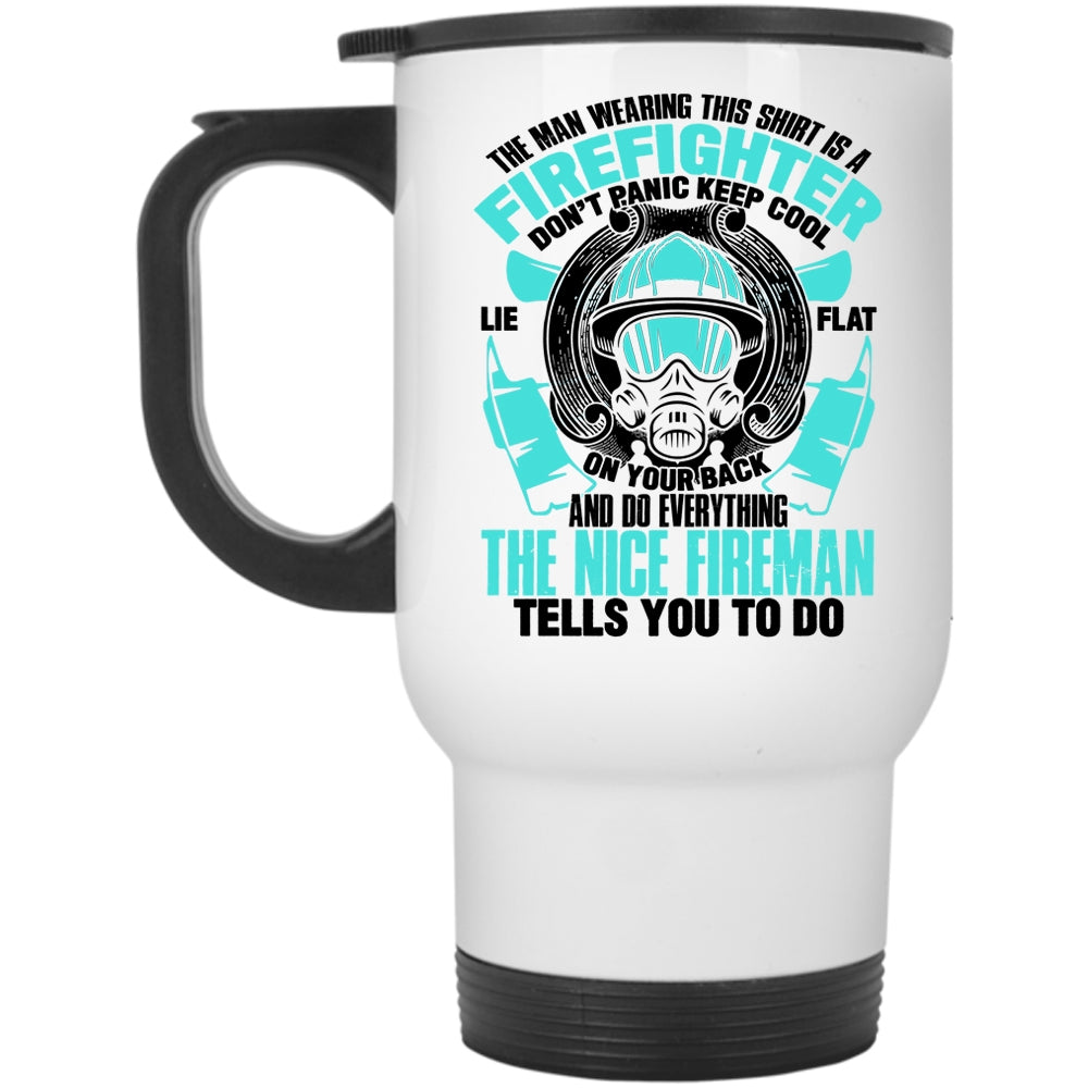 Nice Fireman Travel Mug, The Man Wearing This Shirt Is A Firefighter Mug