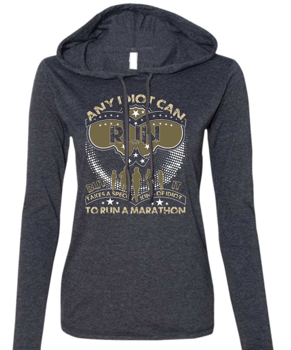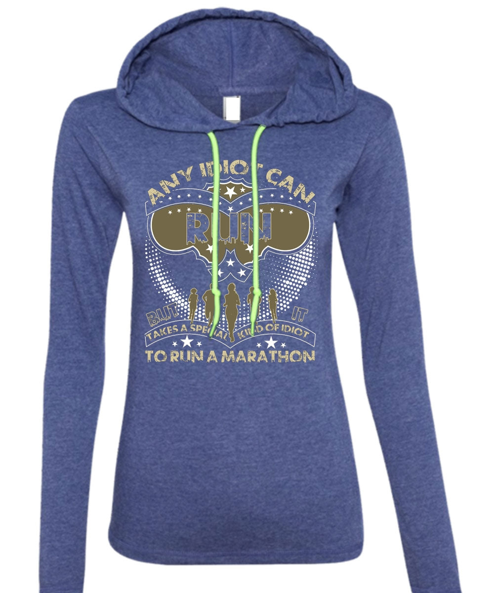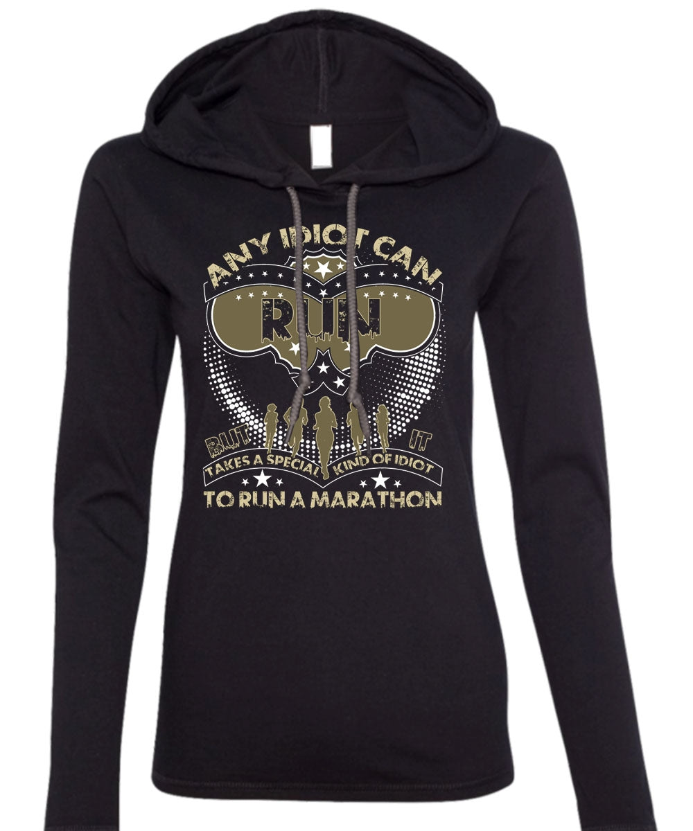 Any Idiot Can Run T Shirt, Run A Marathon T Shirt (Anvil Ladies Ringspun Hooded)