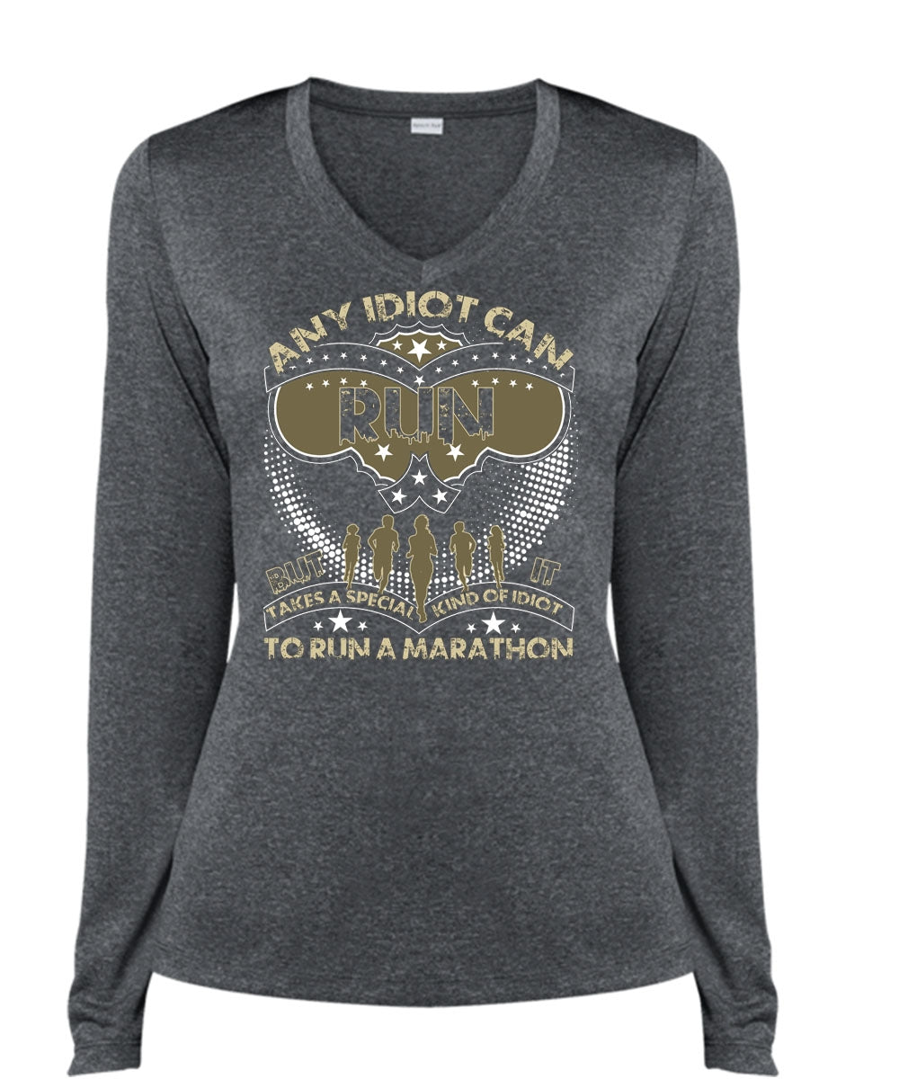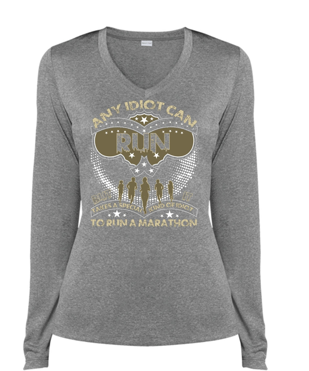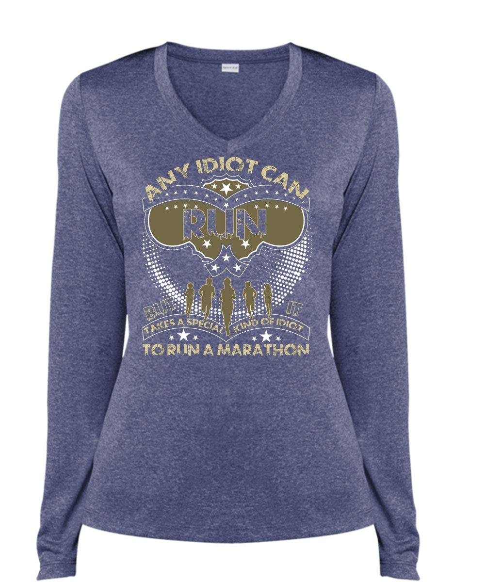 Any Idiot Can Run T Shirt, Run A Marathon T Shirt, Cool Shirt (Ladies LS Heather V-Neck)