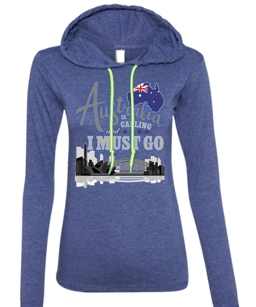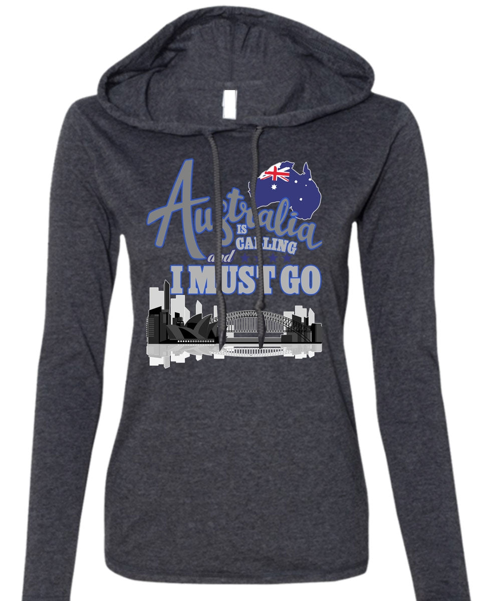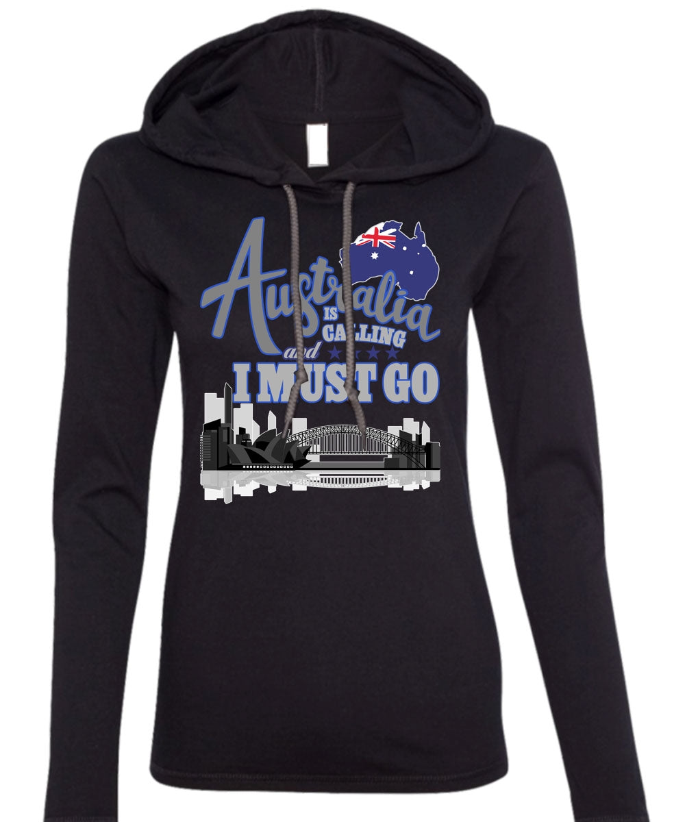 Australia Is Calling T Shirt, I Must Go T Shirt (Anvil Ladies Ringspun Hooded)