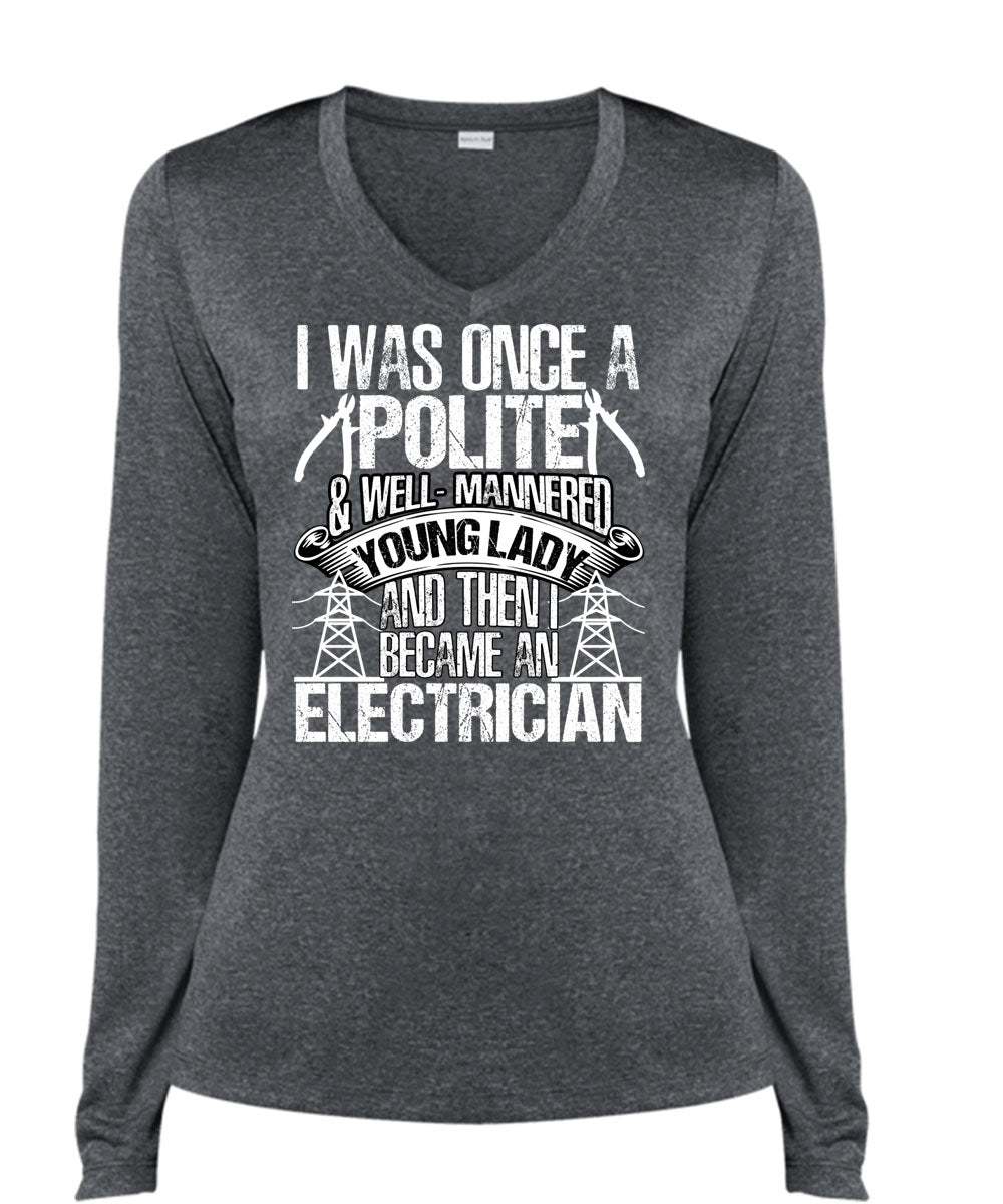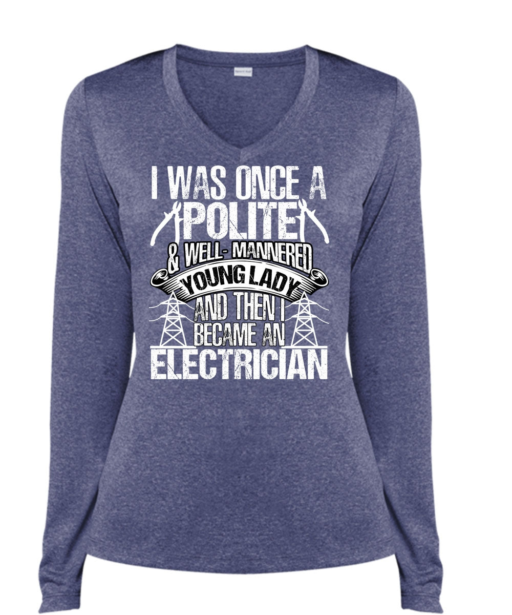 Became An Electrician T Shirt, I Was Once A Polite T Shirt, Cool Shirt (Ladies LS Heather V-Neck)