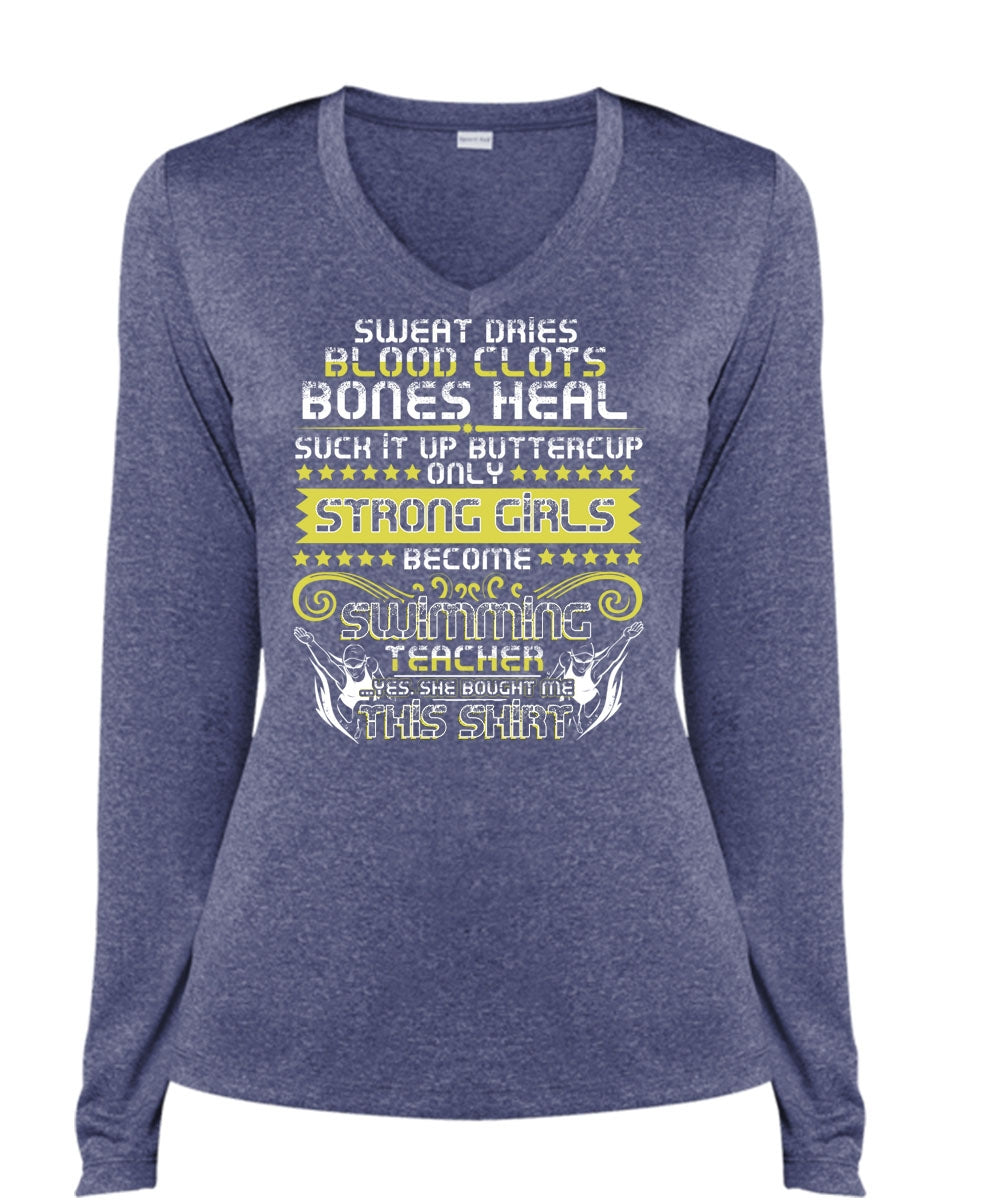 Become Swimming Teacher T Shirt, Sweat Dries Blood Clots T Shirt, Cool Shirt (Ladies LS Heather V-Neck)