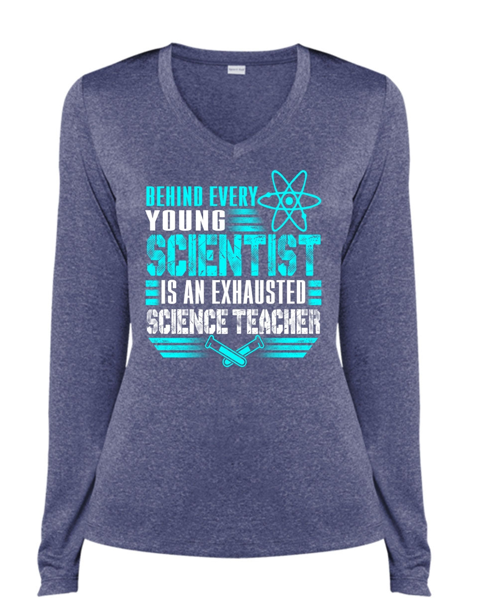 Behind Every Young Scientist T Shirt, Science Teacher T Shirt, Cool Shirt (Ladies LS Heather V-Neck)