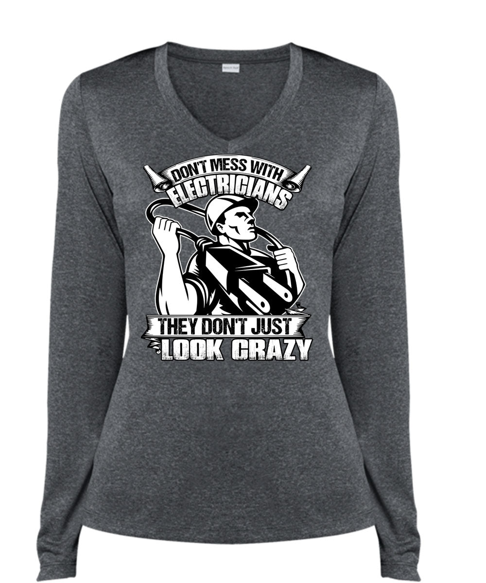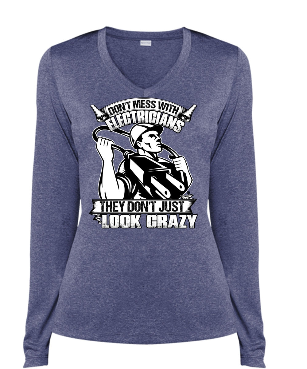 Don't Mess With Electricians T Shirt, Look Crazy T Shirt, Cool Shirt (Ladies LS Heather V-Neck)
