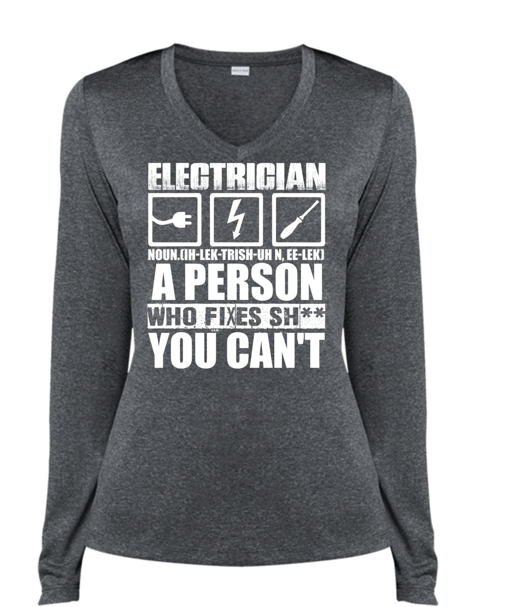 Electrician A Person Who Fixes You Can't T Shirt, Being An Electrician T Shirt, Cool Shirt (Ladies LS Heather V-Neck)
