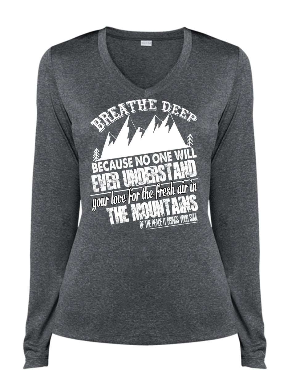 Fresh Air In The Mountains T Shirt, Breathe Deep T Shirt, Cool Shirt (Ladies LS Heather V-Neck)