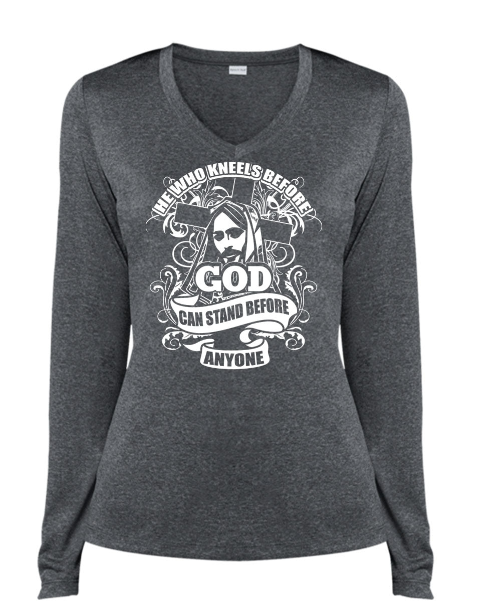 God Can Stand Before Anyone T Shirt, He Who Kneels T Shirt, Cool Shirt (Ladies LS Heather V-Neck)
