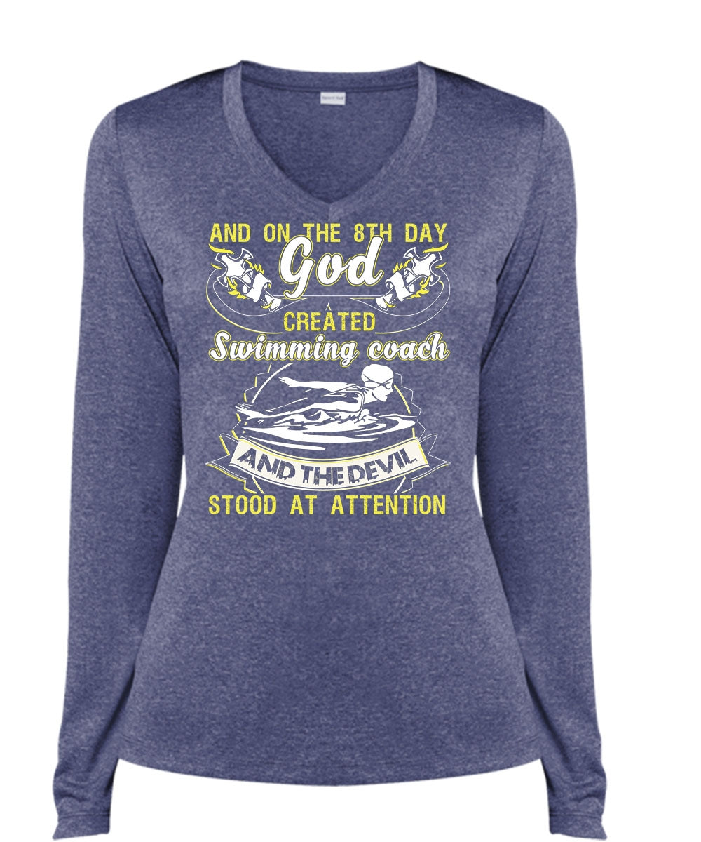 God Created Swimming Coach T Shirt, Being A Swimmer T Shirt, Cool Shirt (Ladies LS Heather V-Neck)