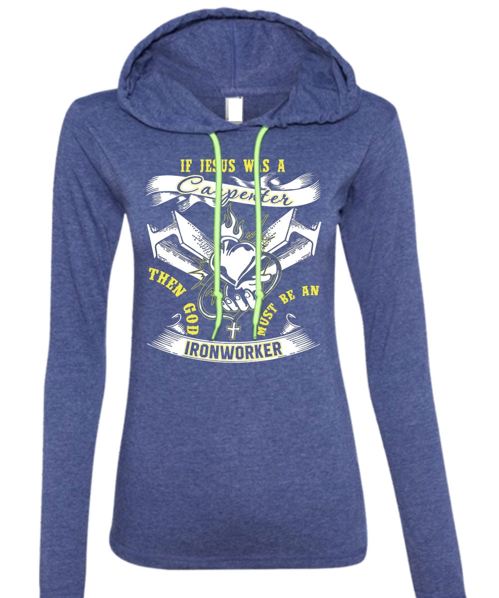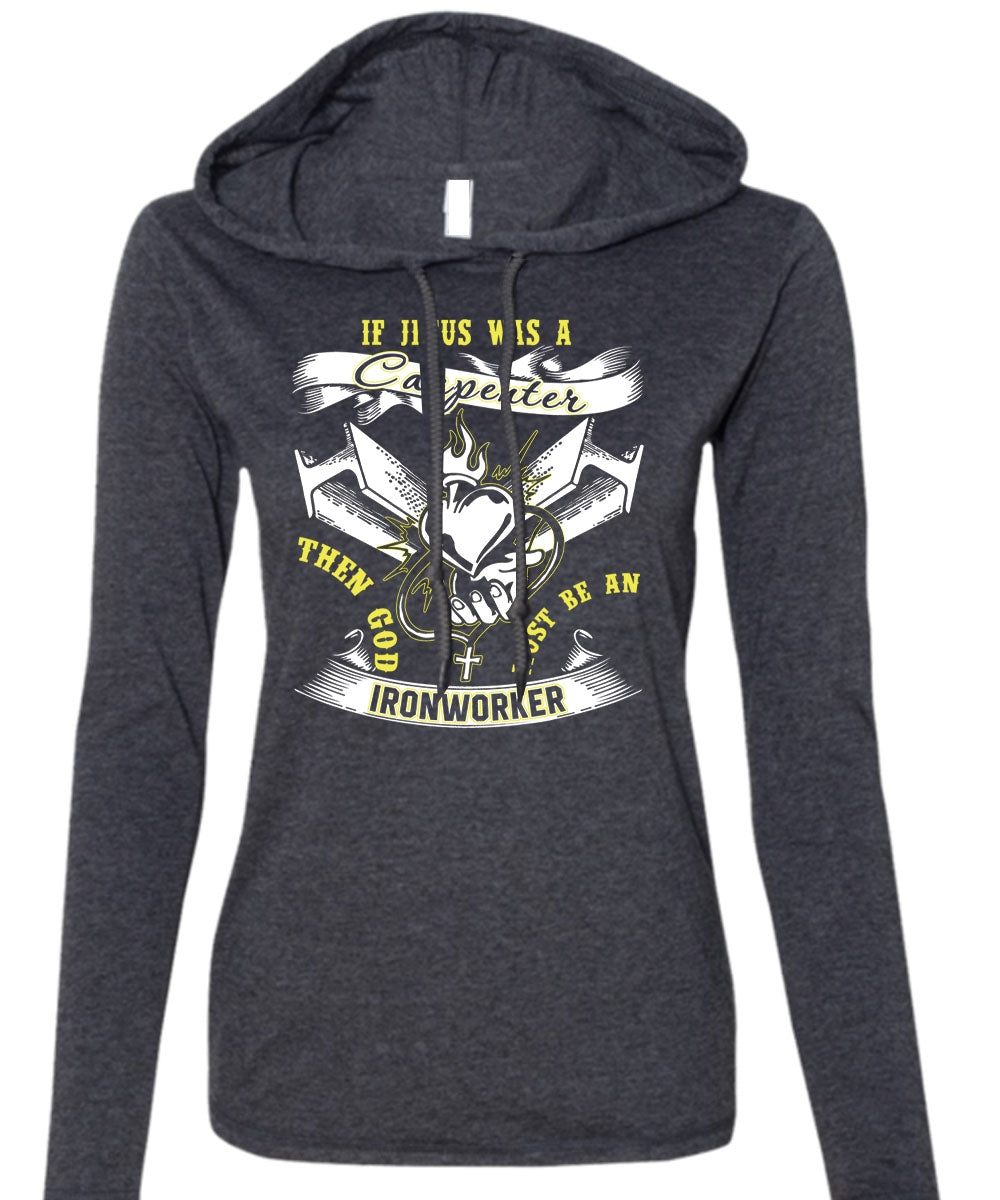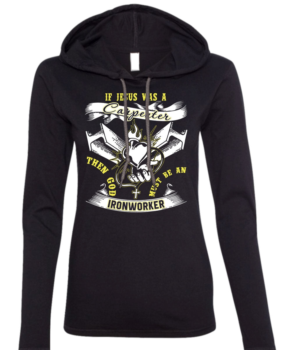 God Must Be An Ironworker T Shirt, Jesus Was A Carpenter T Shirt (Anvil Ladies Ringspun Hooded)