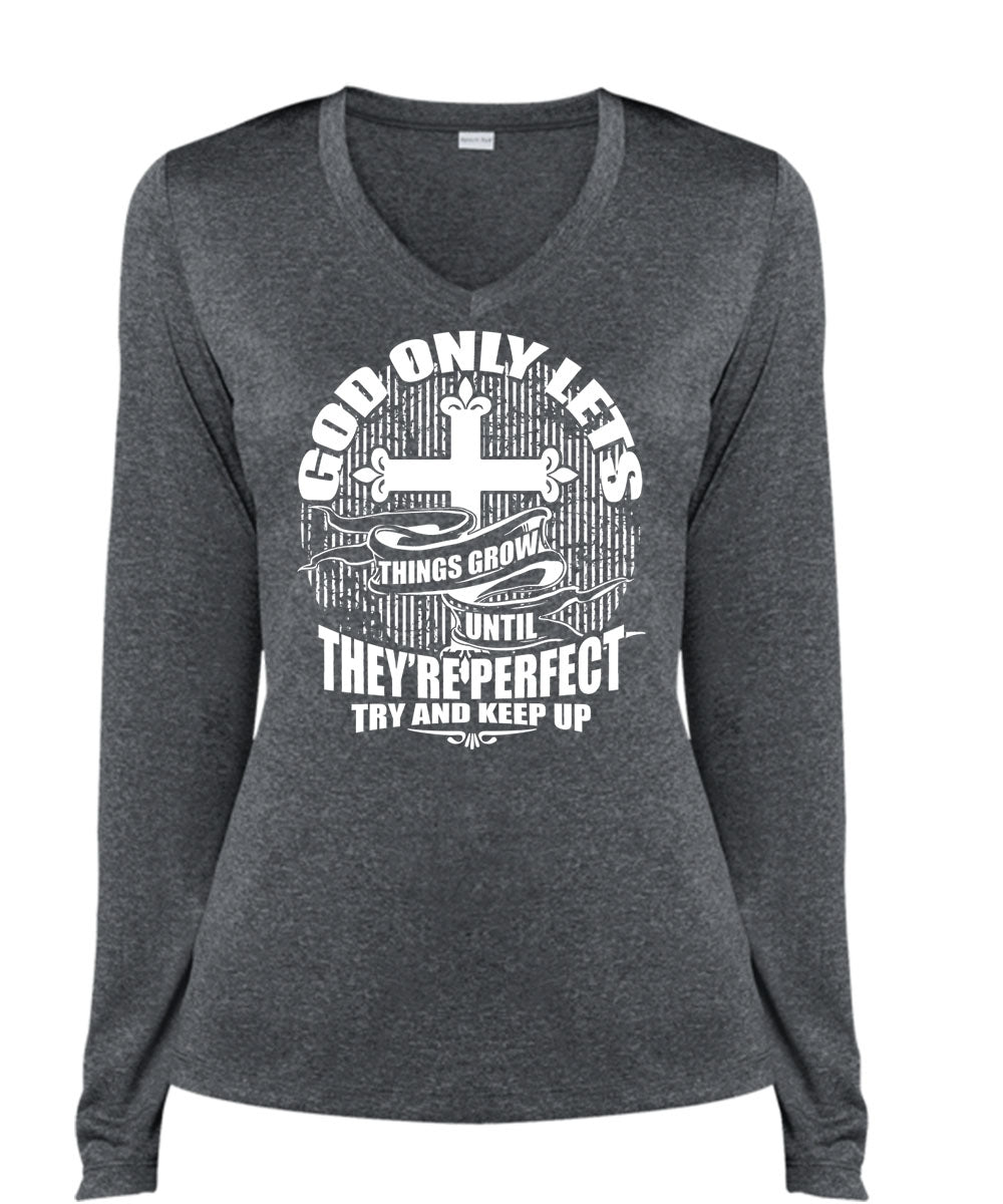 God Only Lets Things Grow T Shirt, Try And Keep Up T Shirt, Cool Shirt (Ladies LS Heather V-Neck)