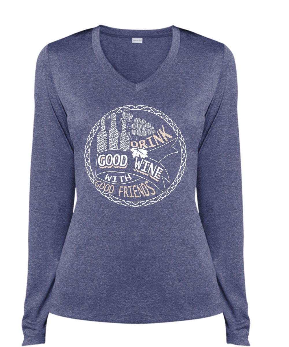 Good Drink Wine With Good Friends T Shirt, My Favorite T Shirt, Cool Shirt (Ladies LS Heather V-Neck)