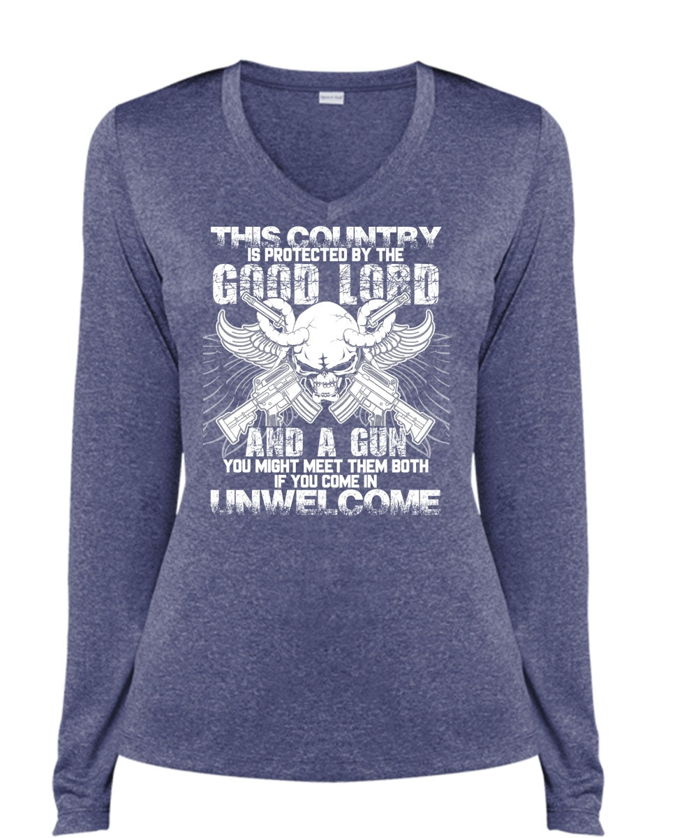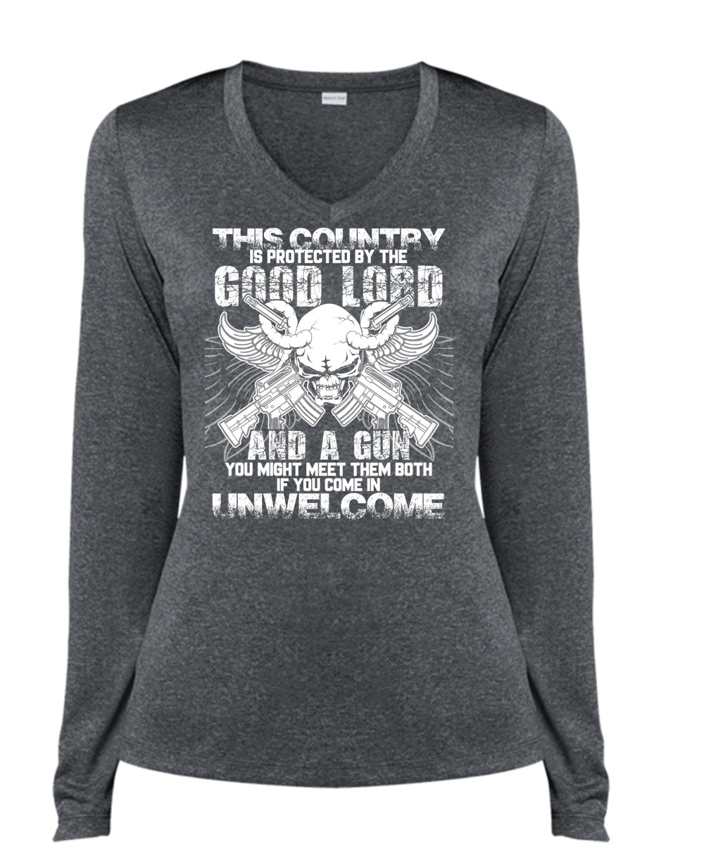 Good Lord And A Gun T Shirt, Being A Gunner T Shirt, Cool Shirt (Ladies LS Heather V-Neck)
