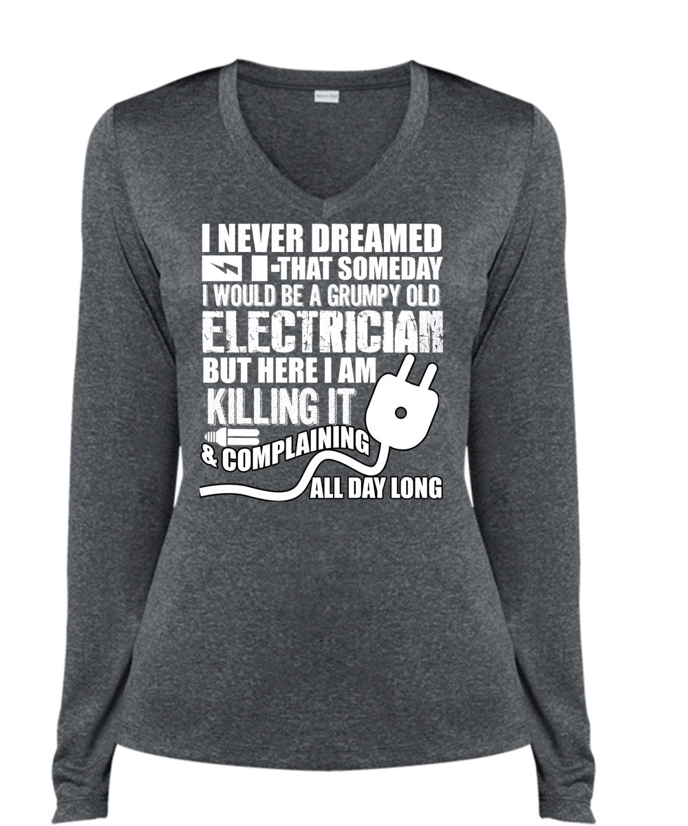 Grumpy Old Electrician T Shirt, I Never Dreamed T Shirt, Cool Shirt (Ladies LS Heather V-Neck)