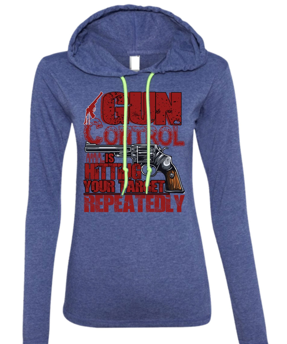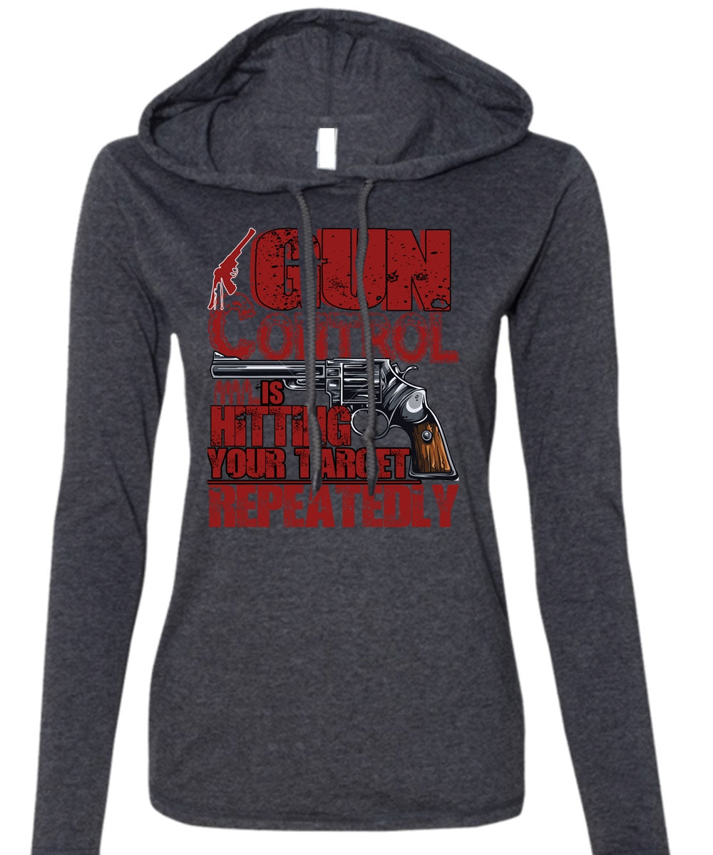 Gun Control Is Hitting T Shirt, Being A Veteran T Shirt (Anvil Ladies Ringspun Hooded)