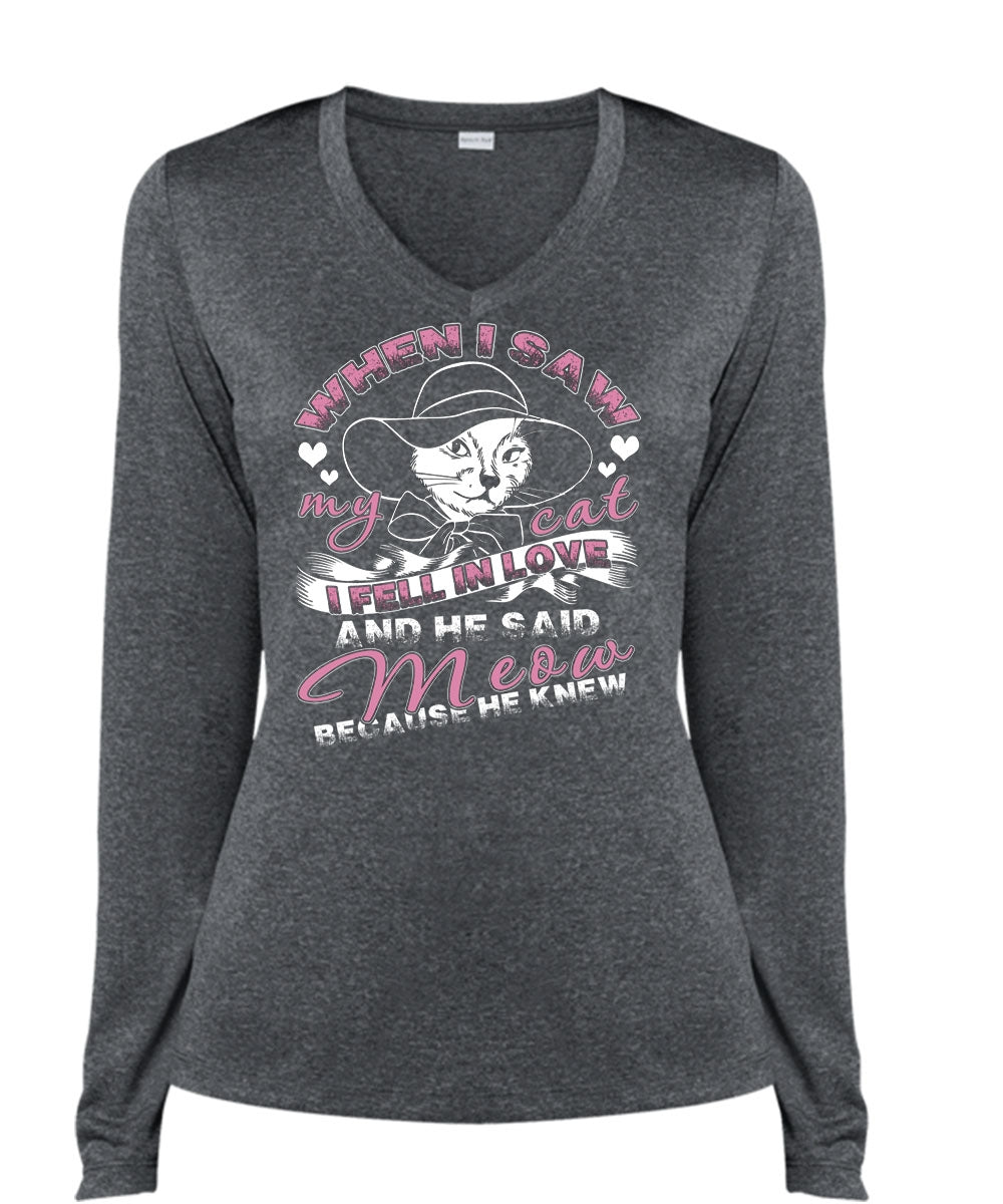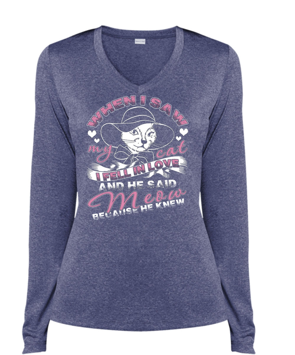 He Said Meow T Shirt, I Saw My Cat T Shirt, Cool Shirt (Ladies LS Heather V-Neck)