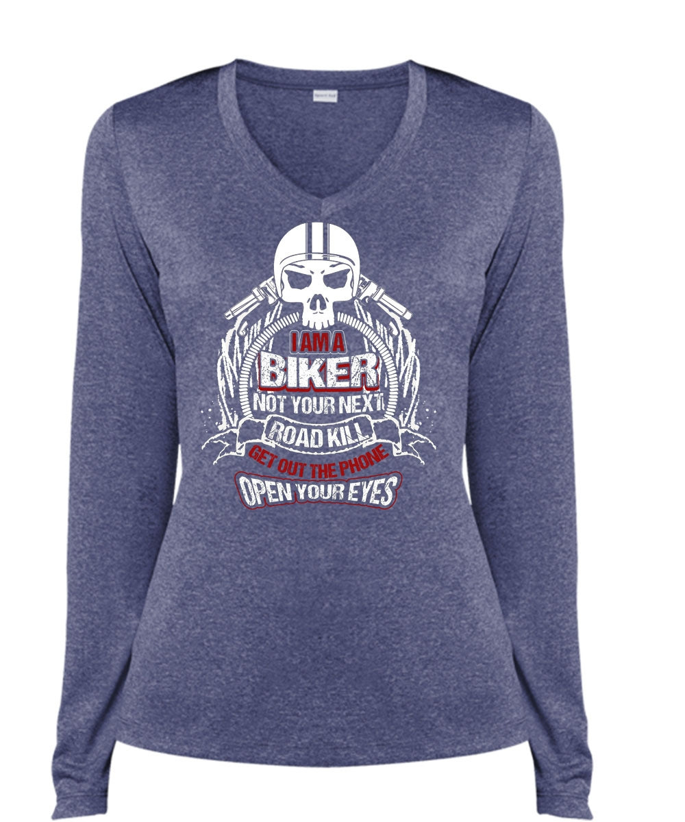 I Am A Biker T Shirt, Road Kill T Shirt, Cool Shirt (Ladies LS Heather V-Neck)