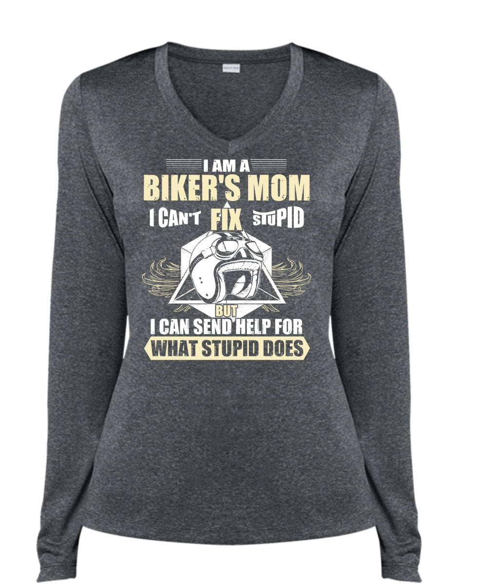 I Am A Biker's Mom T Shirt, Fix Stupid T Shirt, Cool Shirt (Ladies LS Heather V-Neck)
