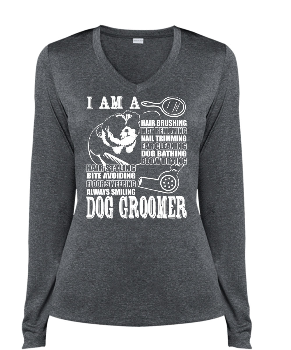 I Am A Hair Brushing T Shirt, Dog Groomer T Shirt, Cool Shirt (Ladies LS Heather V-Neck)