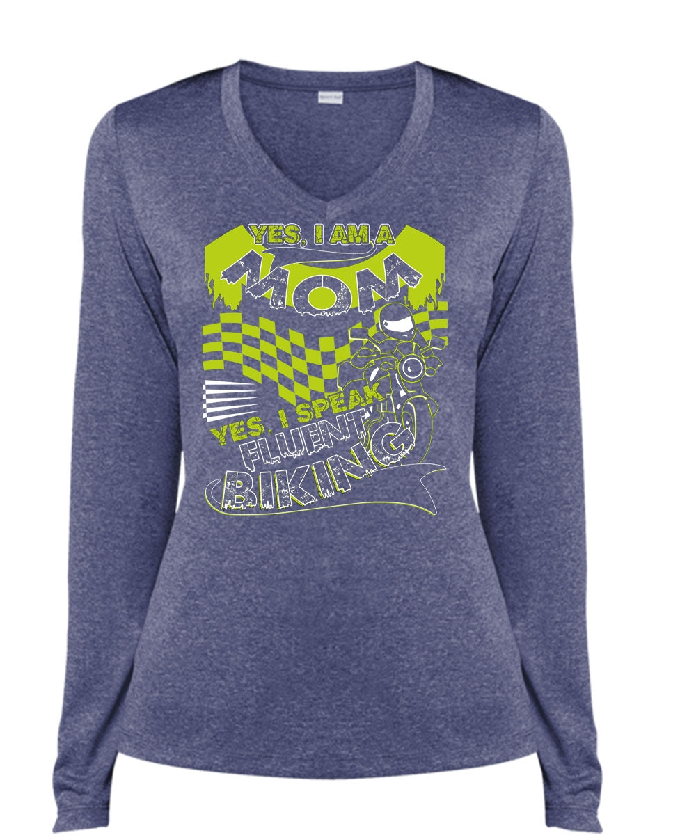 I Am A Mom T Shirt, I Speak Fluent Biking T Shirt, Cool Shirt (Ladies LS Heather V-Neck)