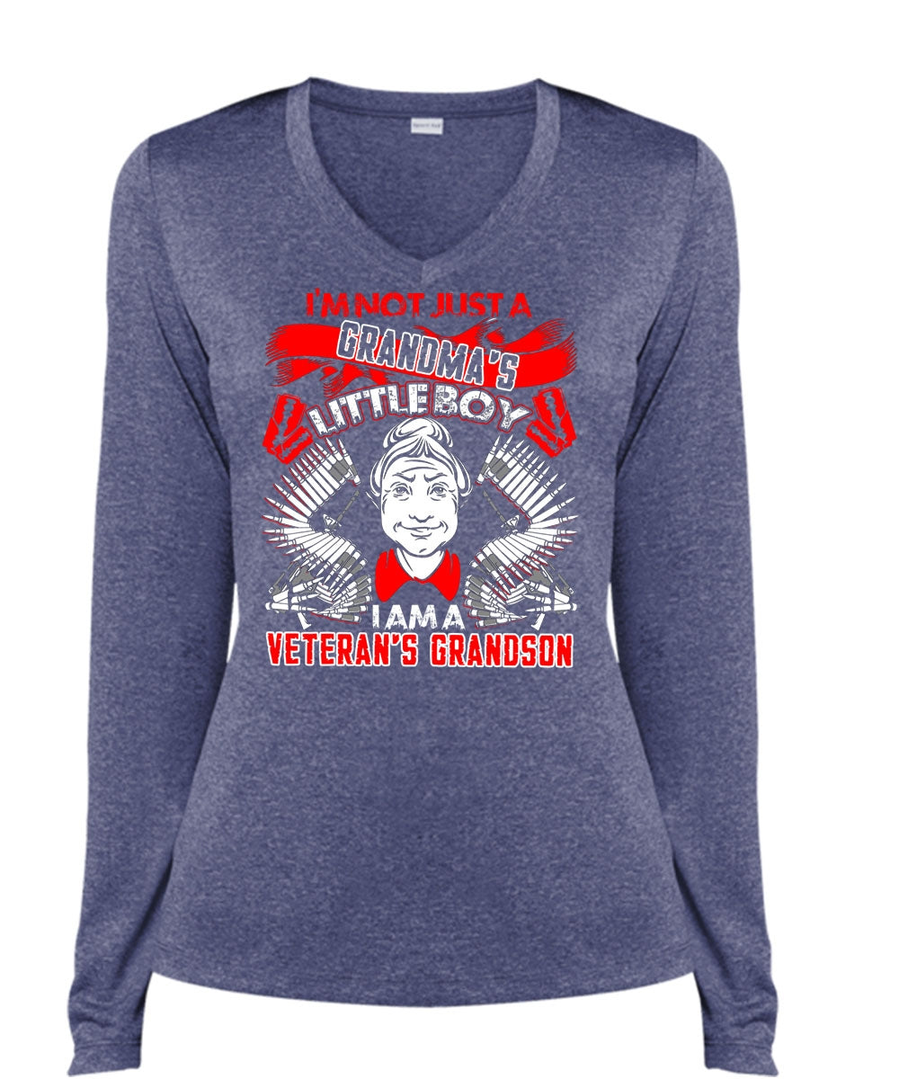 I Am A Veteran's Grandson T Shirt, Grandma's Little Boy T Shirt, Cool Shirt (Ladies LS Heather V-Neck)