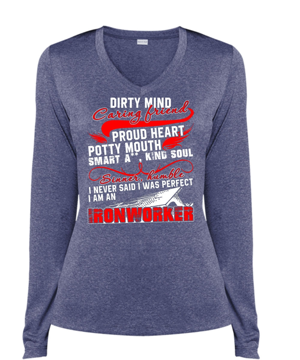 I Am An Ironworker T Shirt, Dirty Mind Caring Friend T Shirt, Cool Shirt (Ladies LS Heather V-Neck)