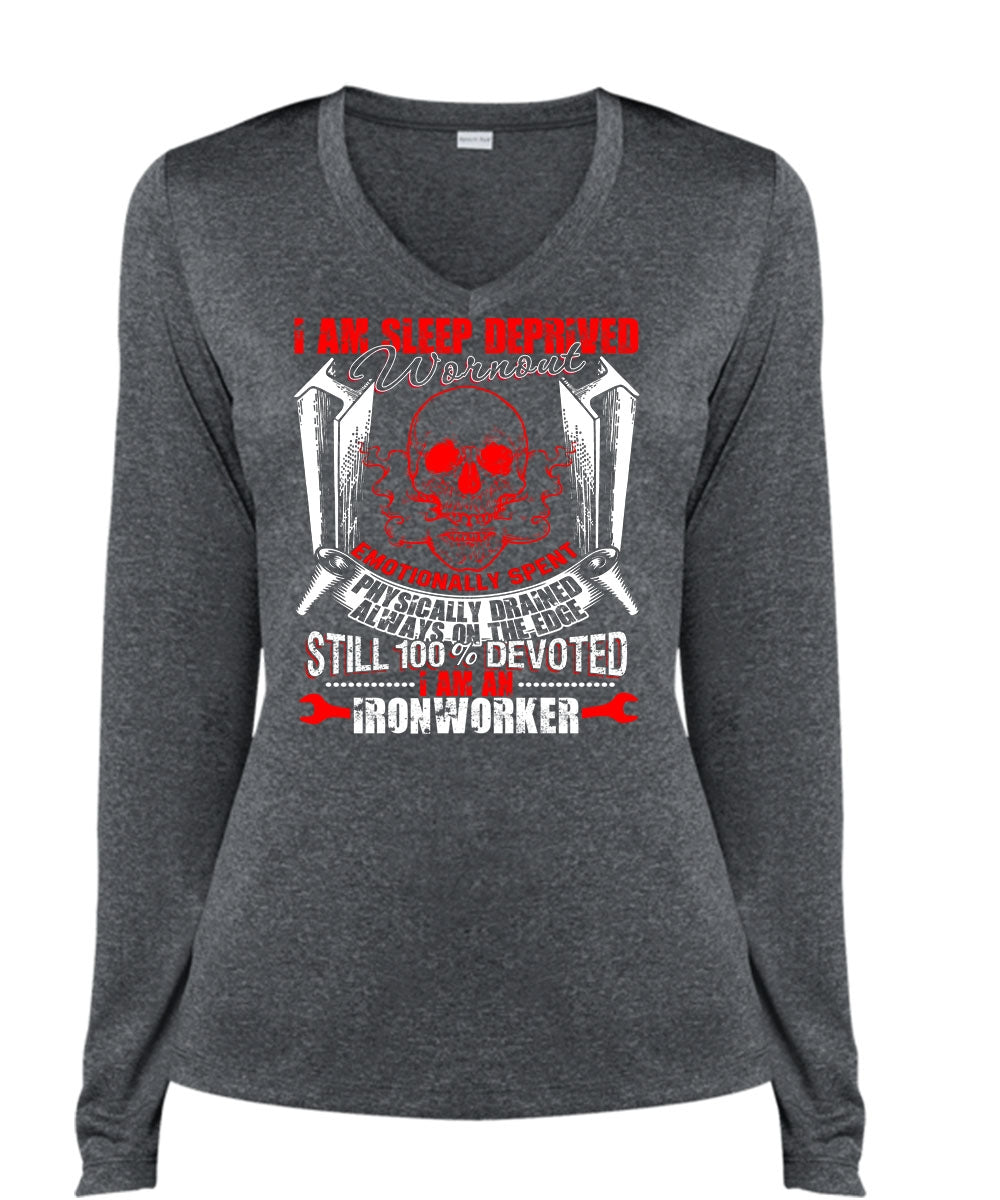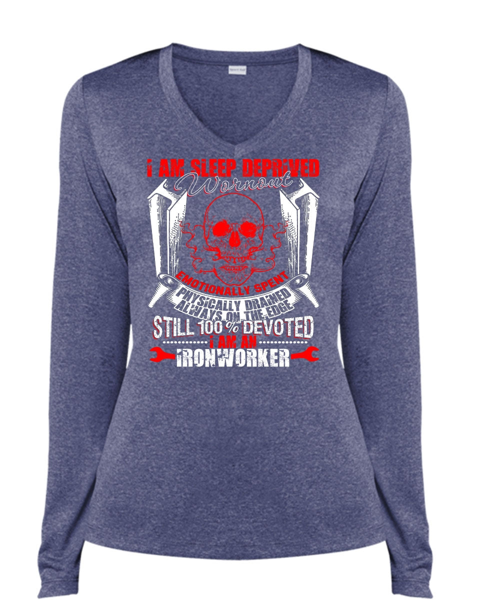 I Am An Ironworker T Shirt, Sleep Deprived Worn Out T Shirt, Cool Shirt (Ladies LS Heather V-Neck)