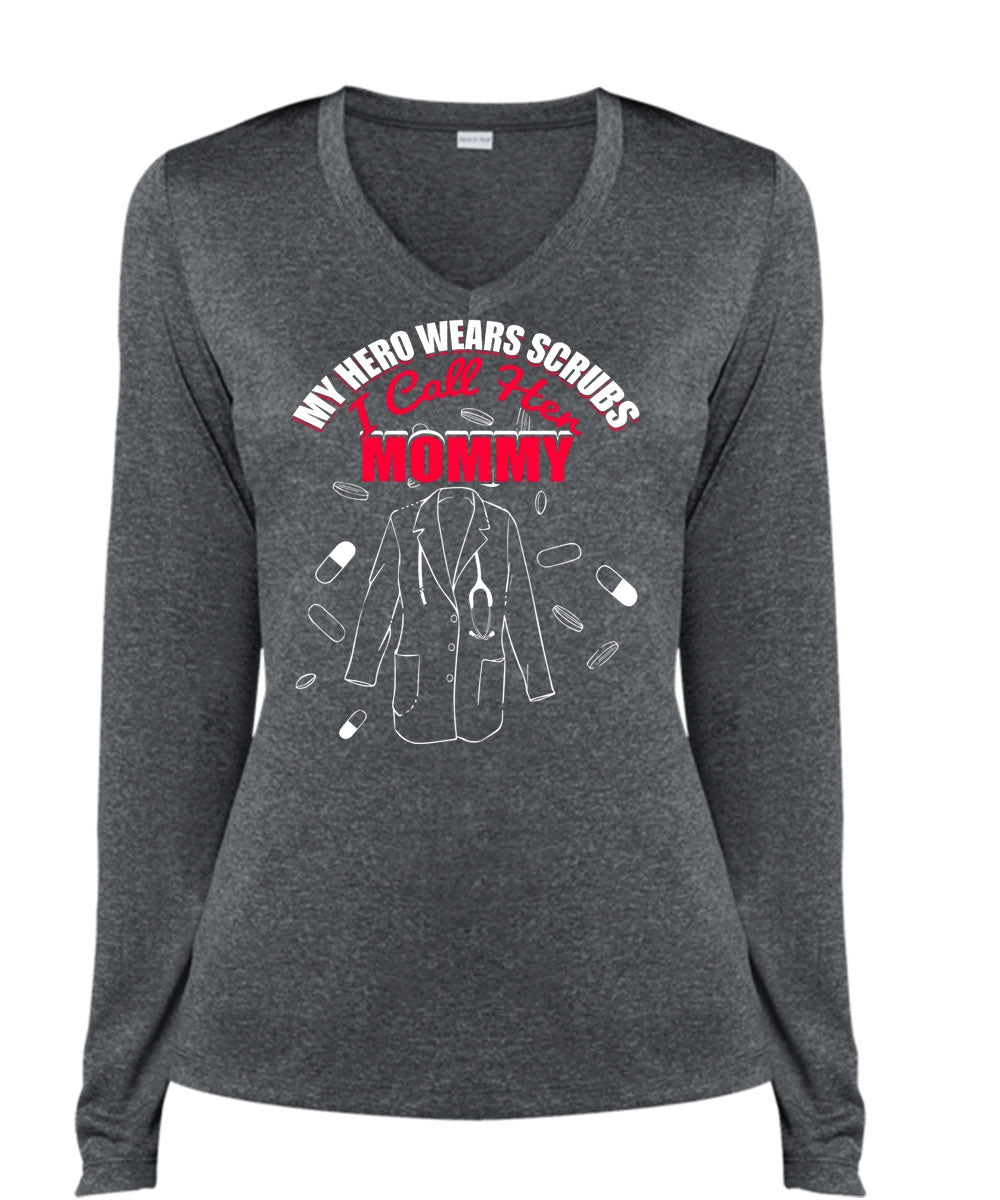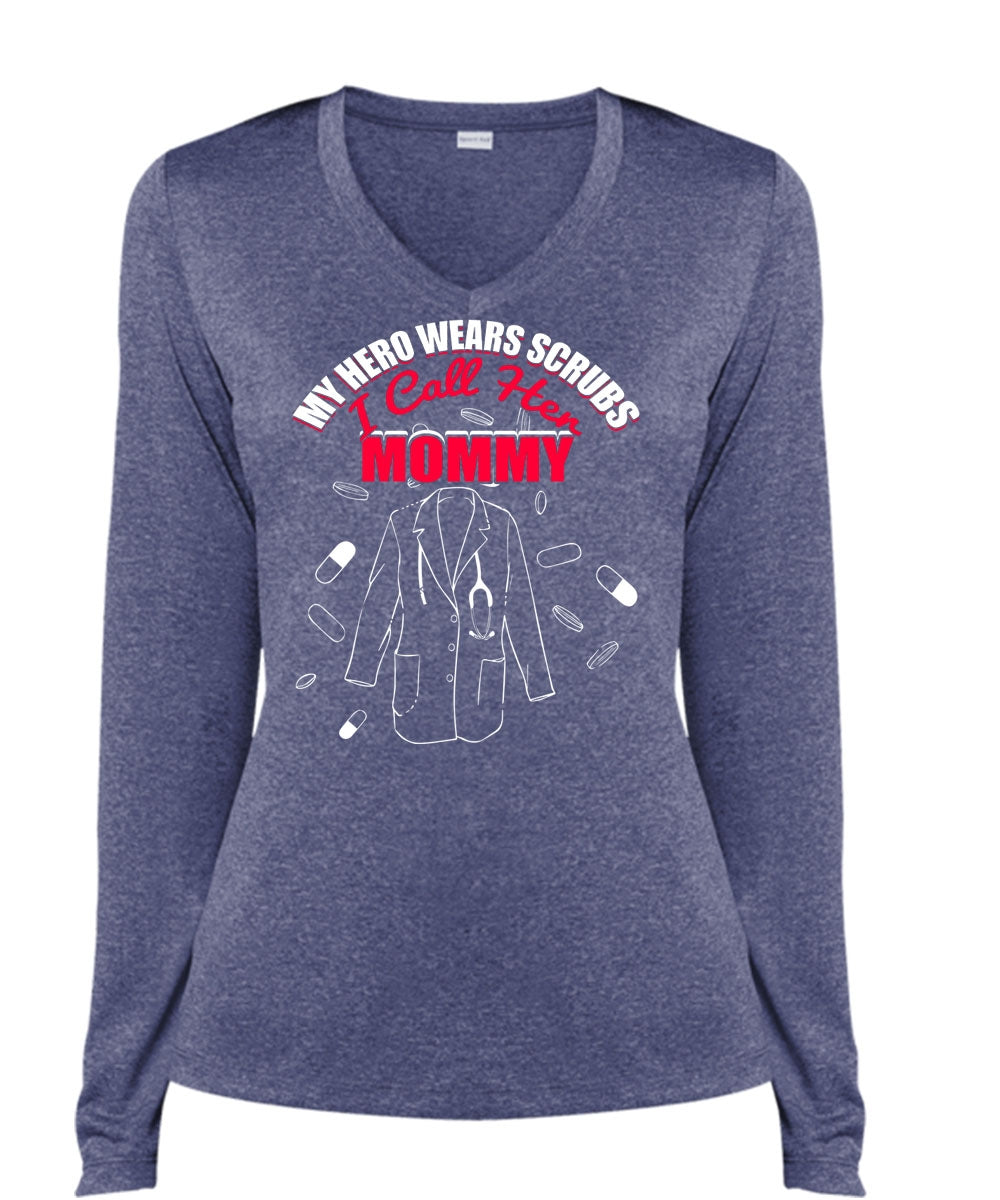 I Call Her Mommy T Shirt, Wears Scrubs T Shirt, Cool Shirt (Ladies LS Heather V-Neck)