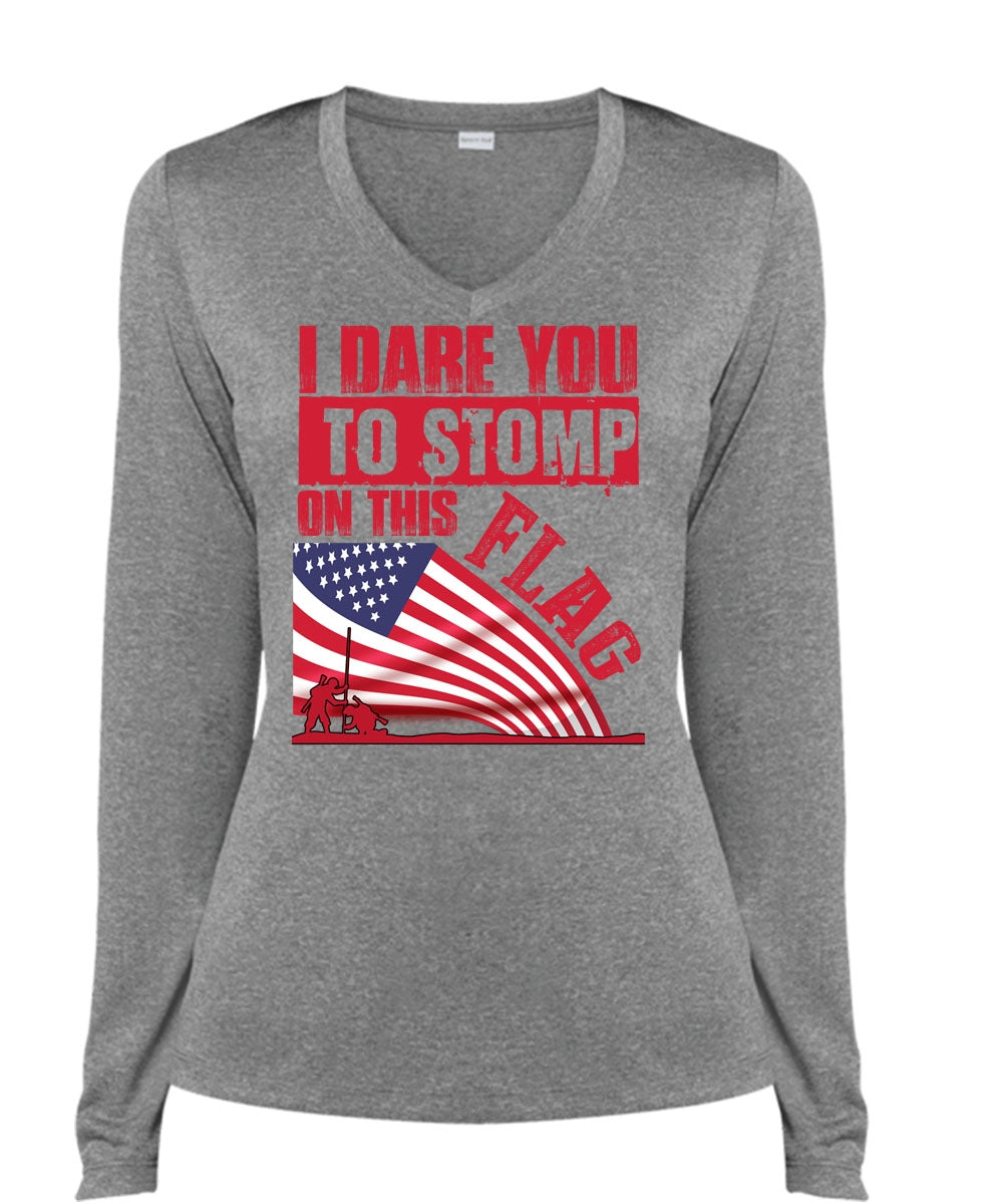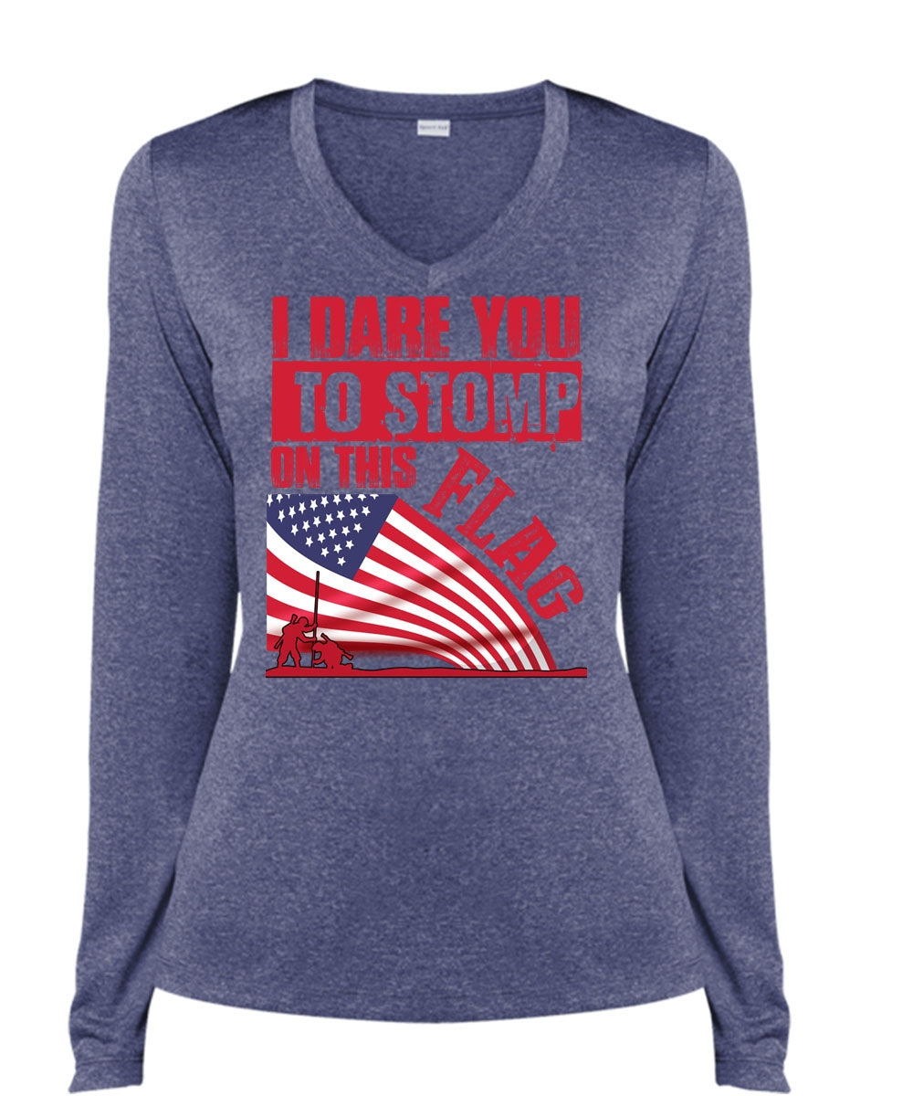 I Dare You To Stomp On This Flag T Shirt, Being A Veteran T Shirt, Cool Shirt (Ladies LS Heather V-Neck)