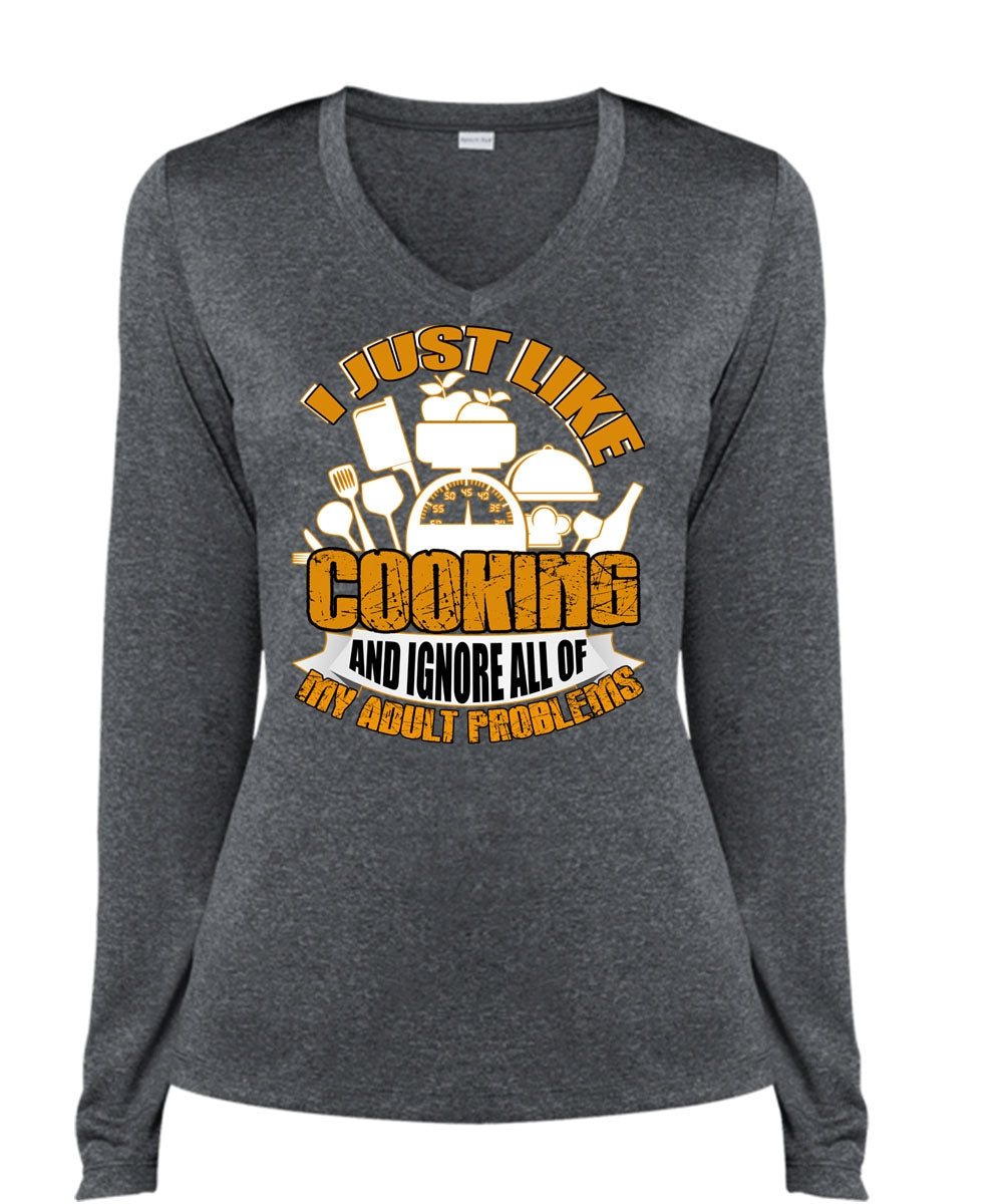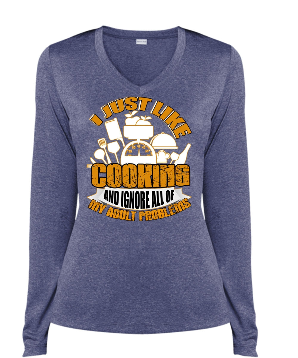 I Just Like Cooking T Shirt, Adult Problems T Shirt, Cool Shirt (Ladies LS Heather V-Neck)