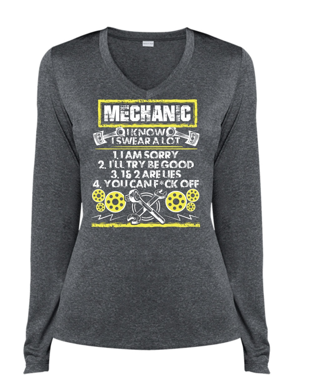 I Know I Swear A Lot T Shirt, Being A Mechanic T Shirt, Cool Shirt (Ladies LS Heather V-Neck)