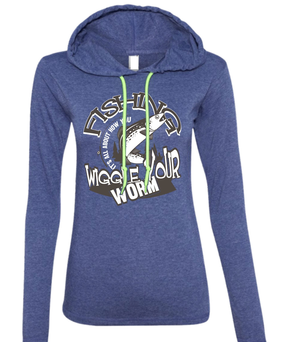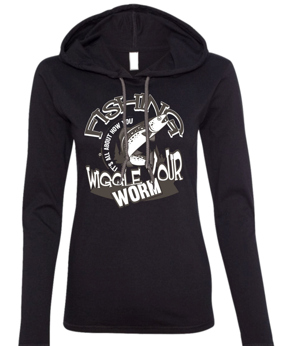 I Love Fishing T Shirt, Wiggle Your Worm T Shirt (Anvil Ladies Ringspun Hooded)