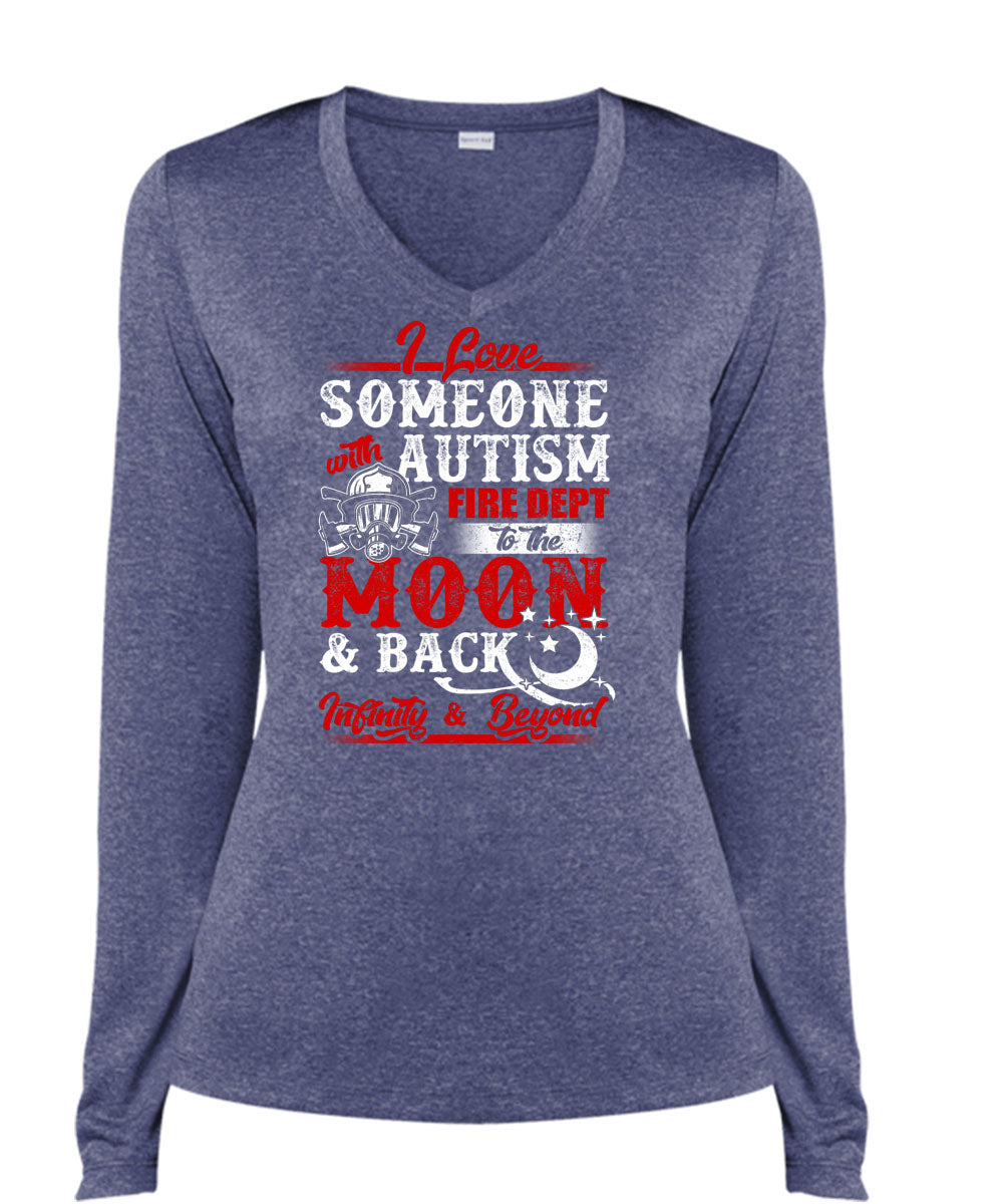 I Love Someone With Autism T Shirt, Fire Dept To The Moon T Shirt, Cool Shirt (Ladies LS Heather V-Neck)