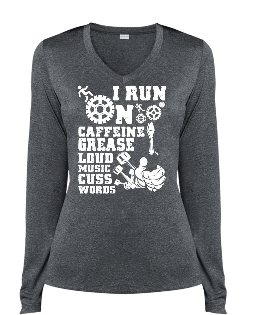 I Run On Caffeine T Shirt, Being A Mechanic T Shirt, Cool Shirt (Ladies LS Heather V-Neck)