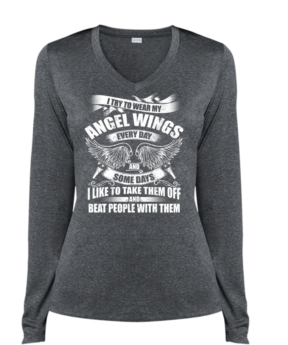 I Try To Wear My Angel Wings T Shirt, I Love My Life T Shirt, Cool Shirt (Ladies LS Heather V-Neck)