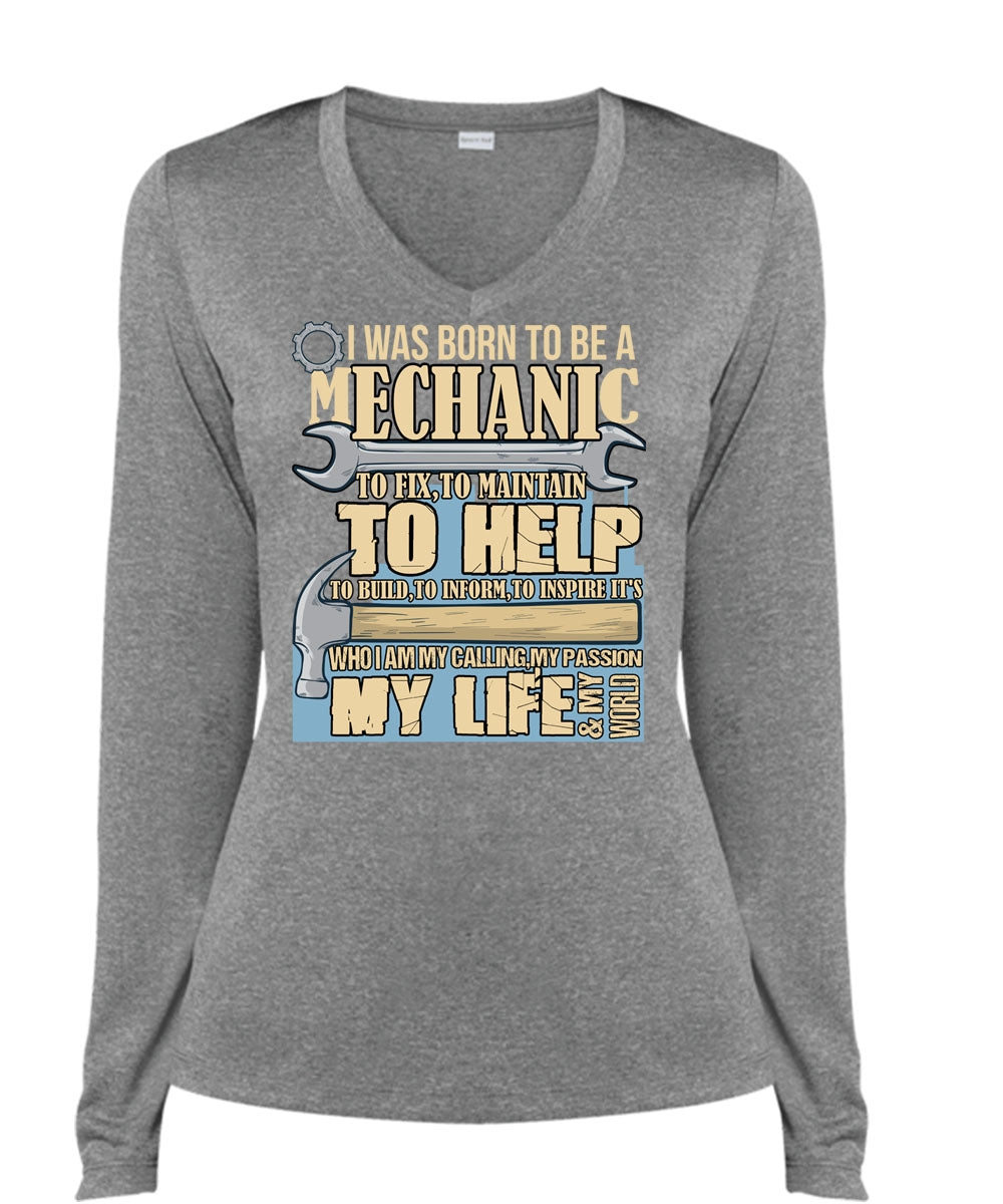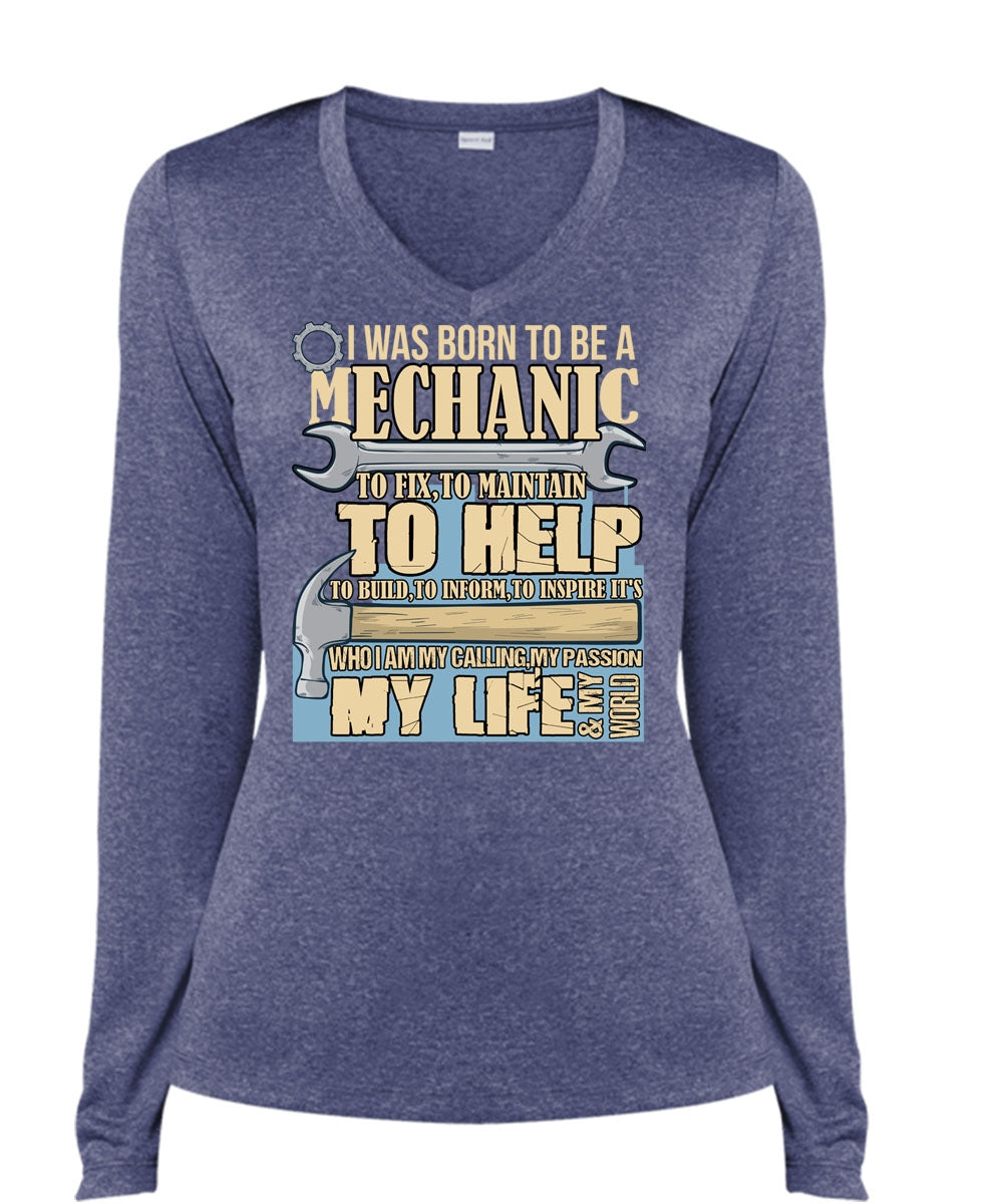I Was Born To Be A Mechanic T Shirt, My Life T Shirt, Cool Shirt (Ladies LS Heather V-Neck)