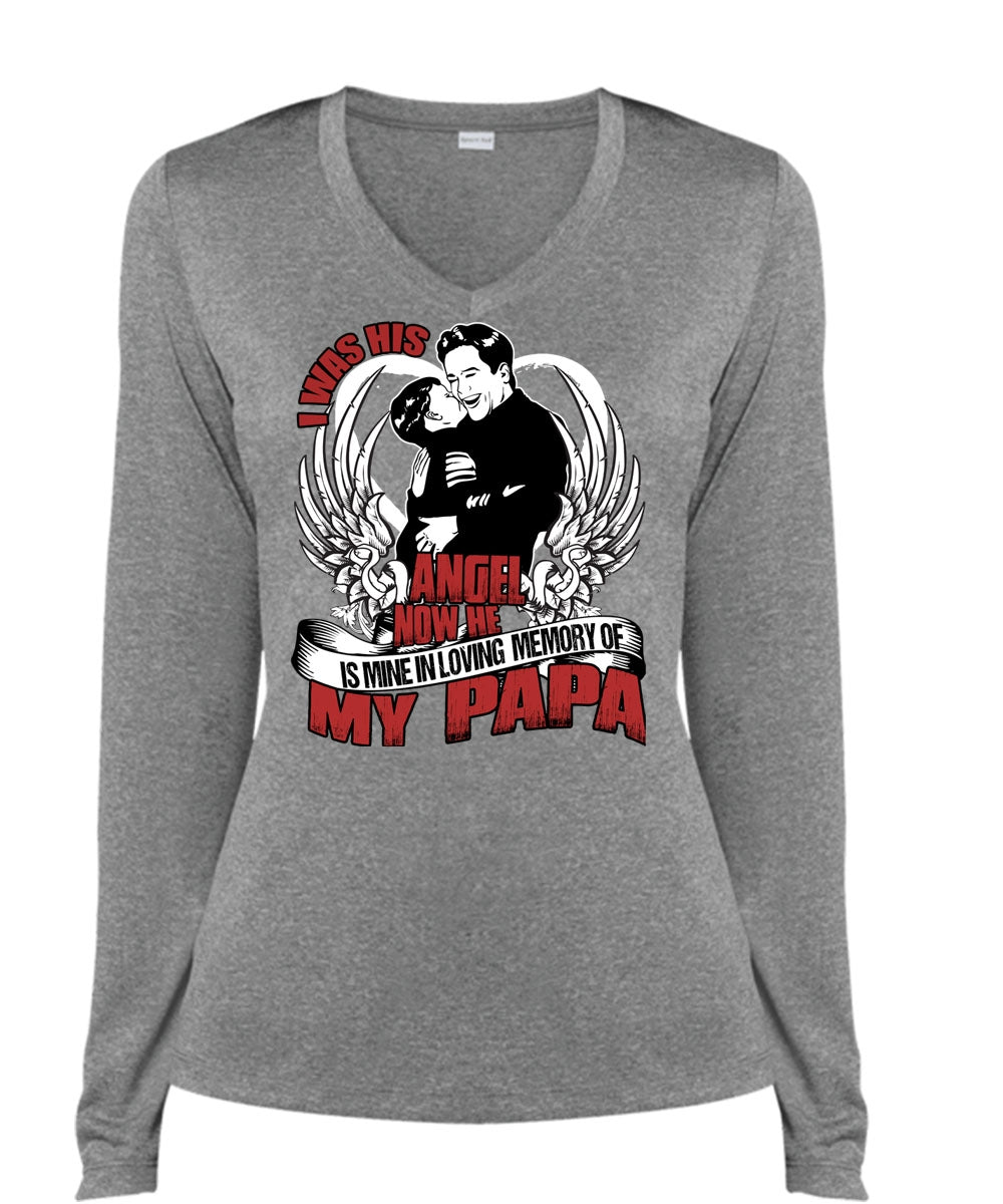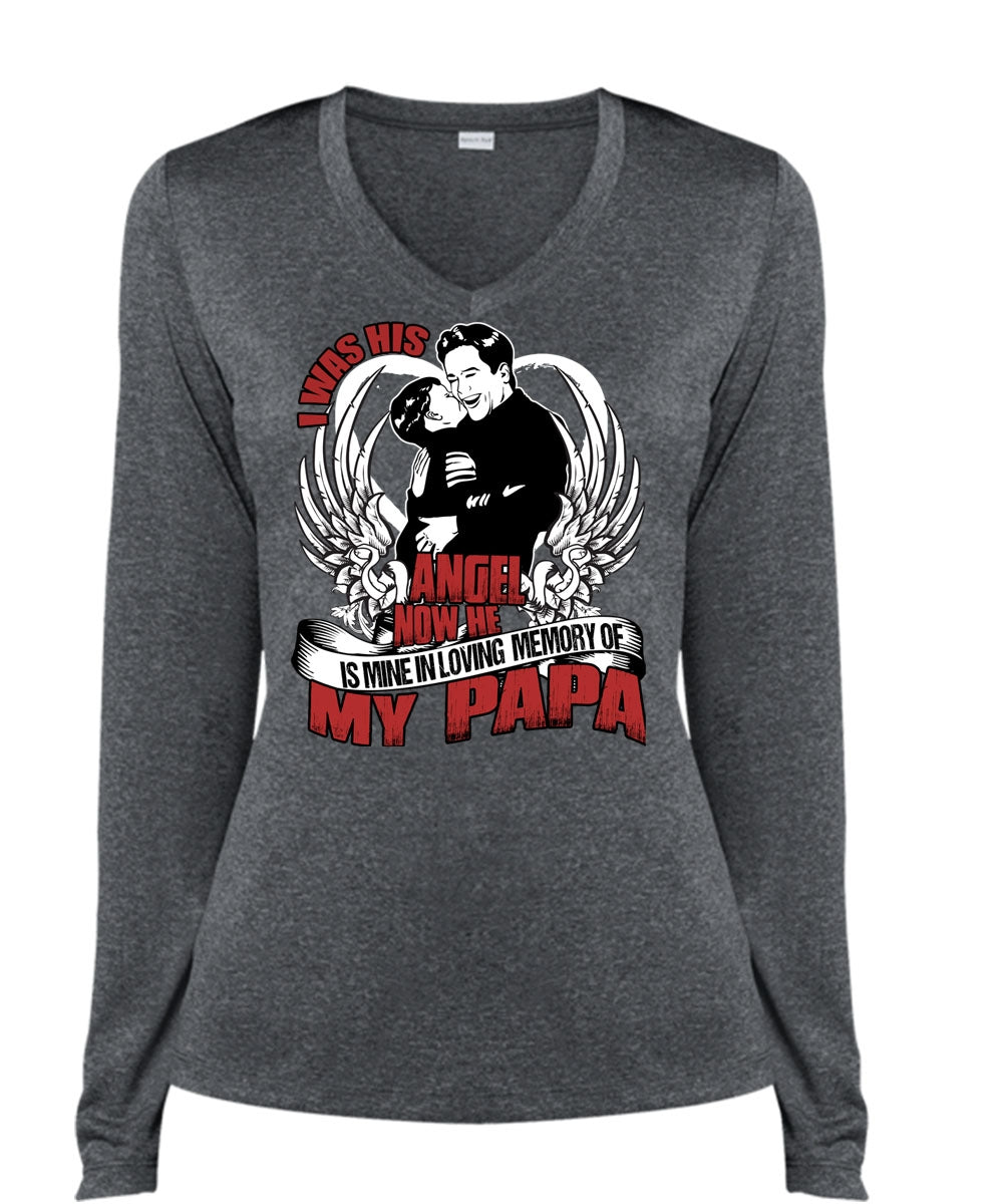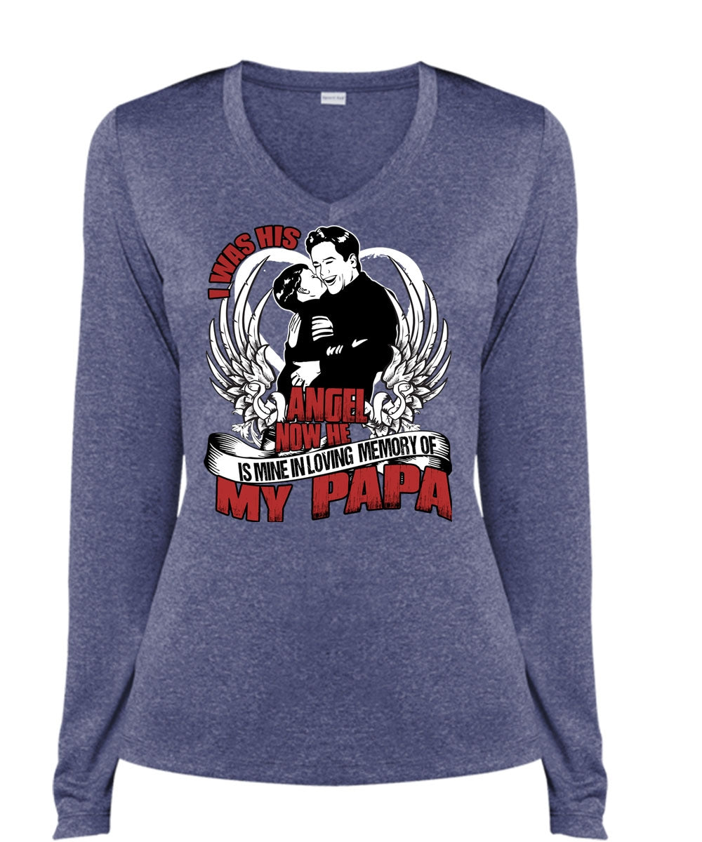 I Was His Angel Now T Shirt, Loving Memory Of My Papa T Shirt, Cool Shirt (Ladies LS Heather V-Neck)