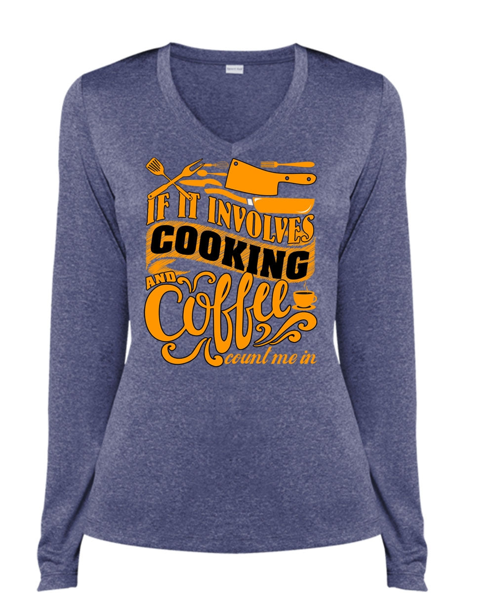 If It Involves Cooking T Shirt, Coffee Count Me In T Shirt, Cool Shirt (Ladies LS Heather V-Neck)