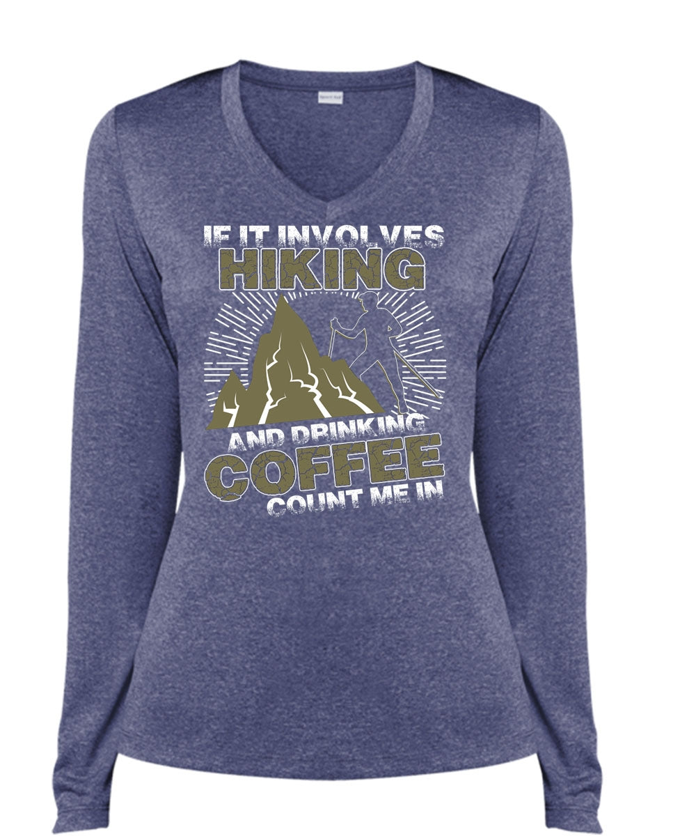 If It Involves Hiking T Shirt, Drinking Coffee Count Me In T Shirt, Cool Shirt (Ladies LS Heather V-Neck)