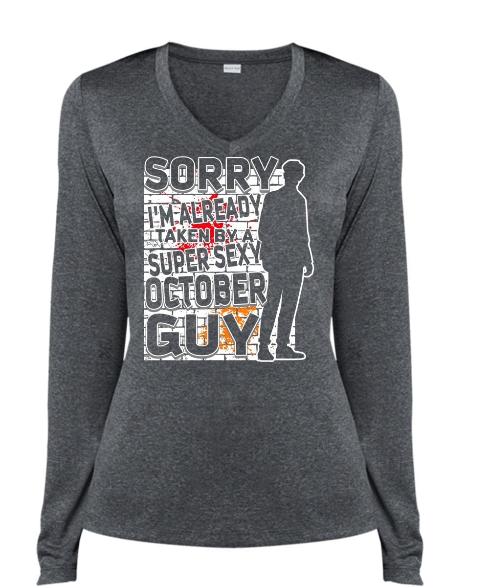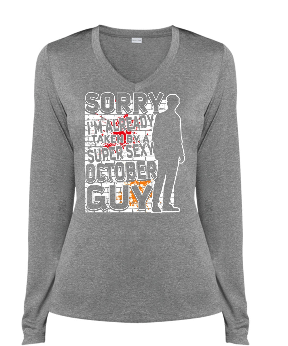 I'm Already Taken By A October Guy T Shirt, Being A Boyfriend T Shirt, Cool Shirt (Ladies LS Heather V-Neck)