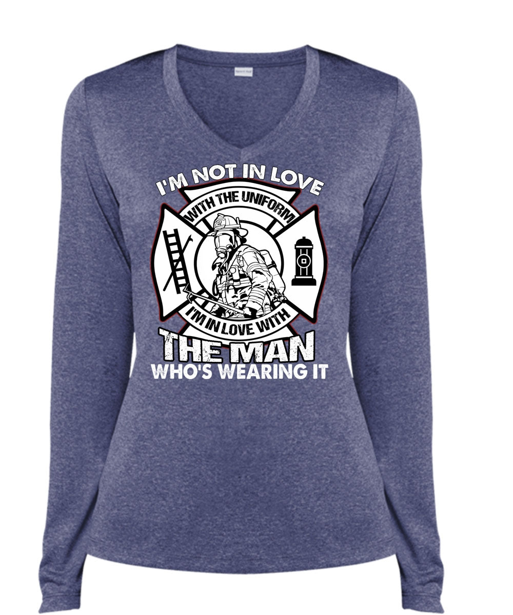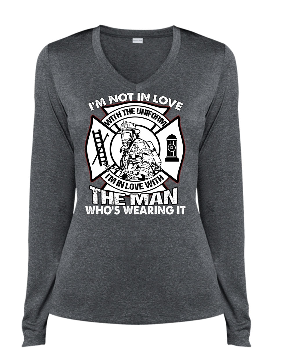 I'm Not In Love T Shirt, Being A Firefighter T Shirt, Cool Shirt (Ladies LS Heather V-Neck)
