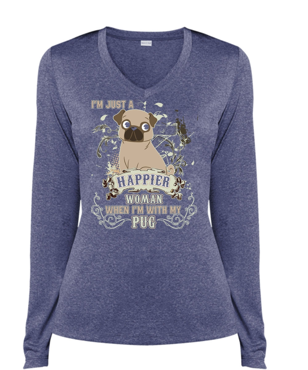 I'm With My Pug T Shirt, I'm Just A Happier Woman T Shirt, Cool Shirt (Ladies LS Heather V-Neck)