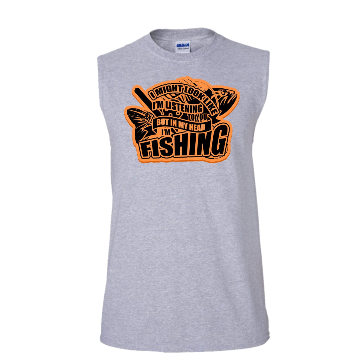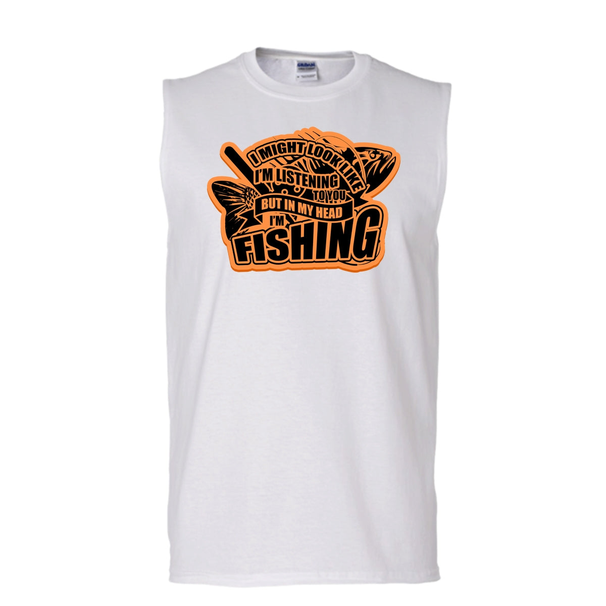 In My Head I'm Fishing T Shirt, Coolest Fishing Tank Top (Men's Cotton Sleeveless)