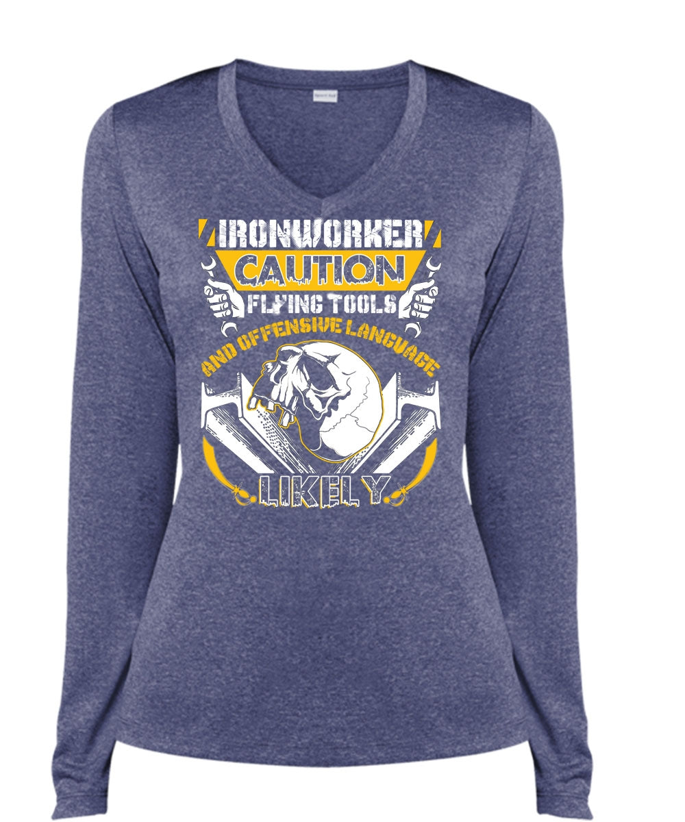 Ironworker Caution Flying Tools T Shirt, Being An Ironworker T Shirt, Cool Shirt (Ladies LS Heather V-Neck)