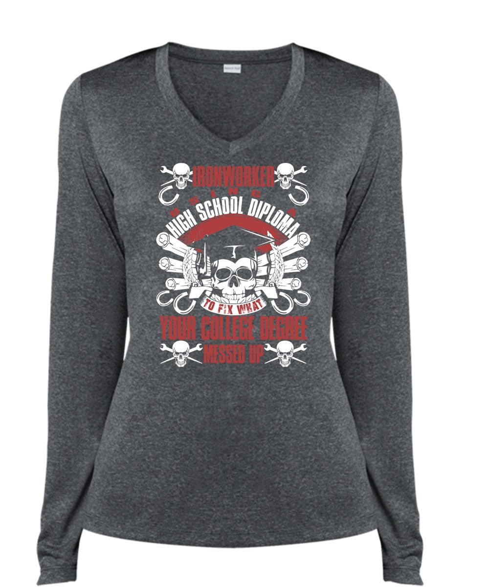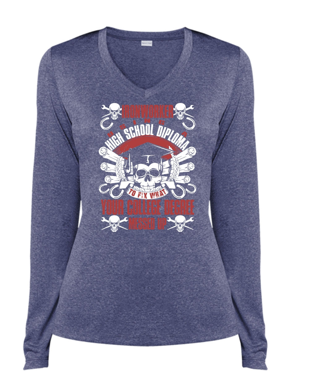 Ironworker Using A High School T Shirt, College Degree T Shirt, Cool Shirt (Ladies LS Heather V-Neck)
