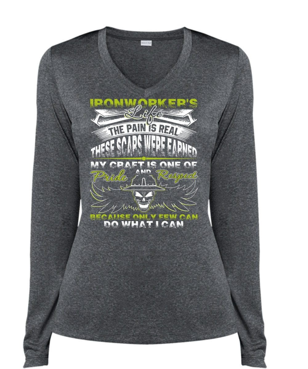 Ironworker's Life T Shirt, The Pain Is Real T Shirt, Cool Shirt (Ladies LS Heather V-Neck)
