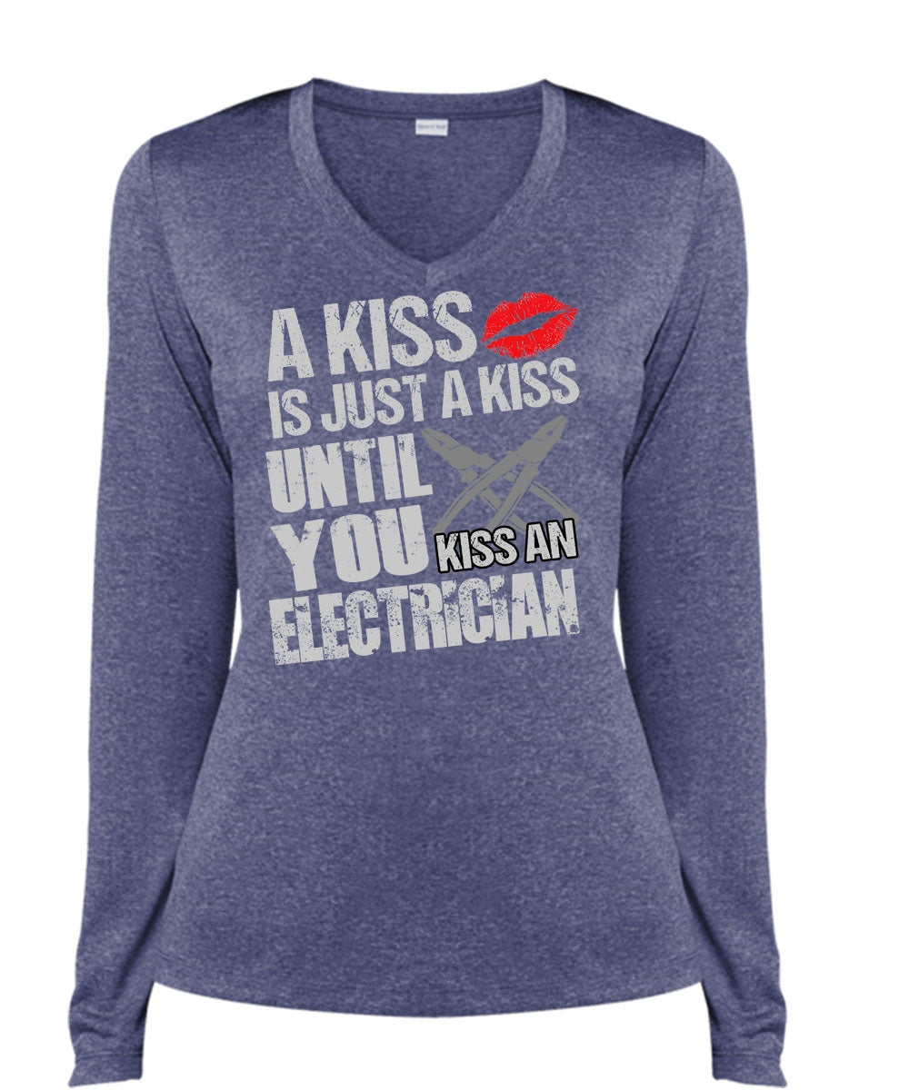 Kiss An Electrician T Shirt, I Love Electrician T Shirt, Cool Shirt (Ladies LS Heather V-Neck)